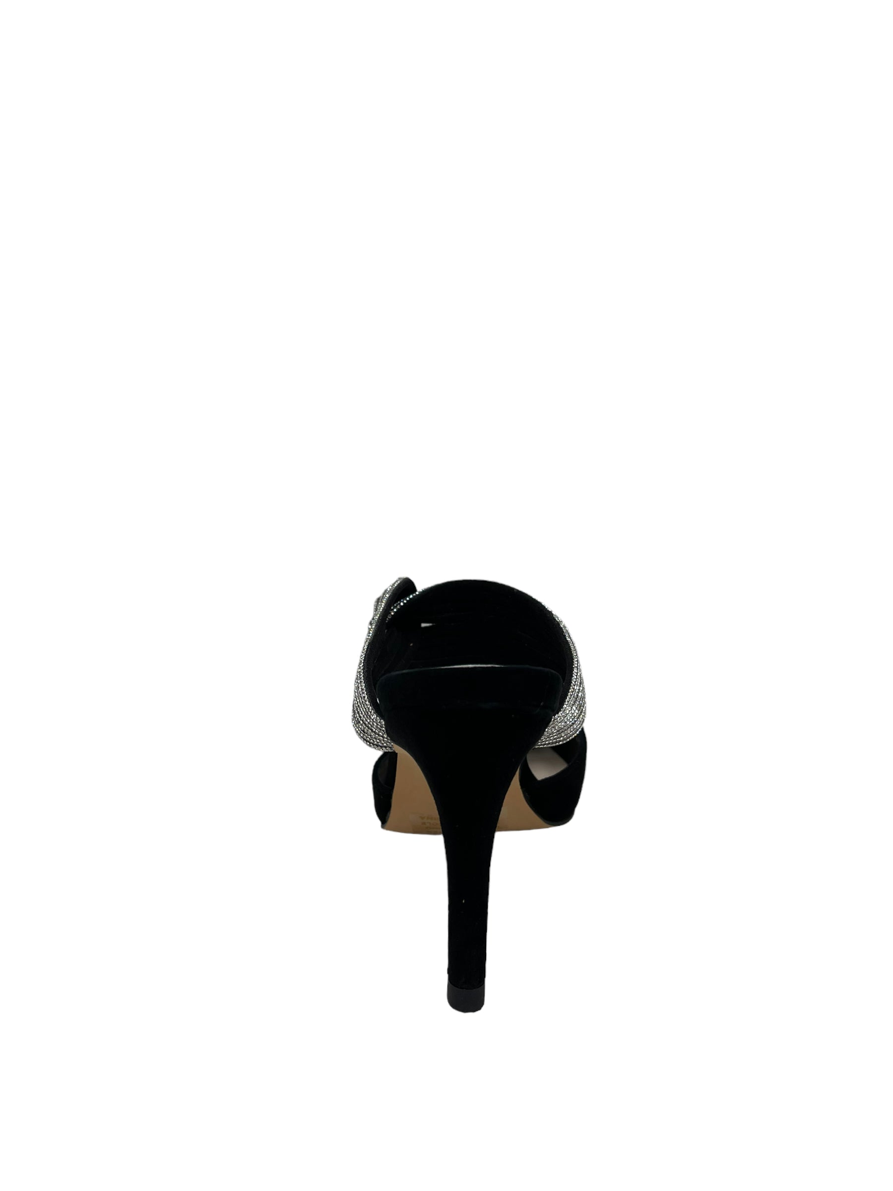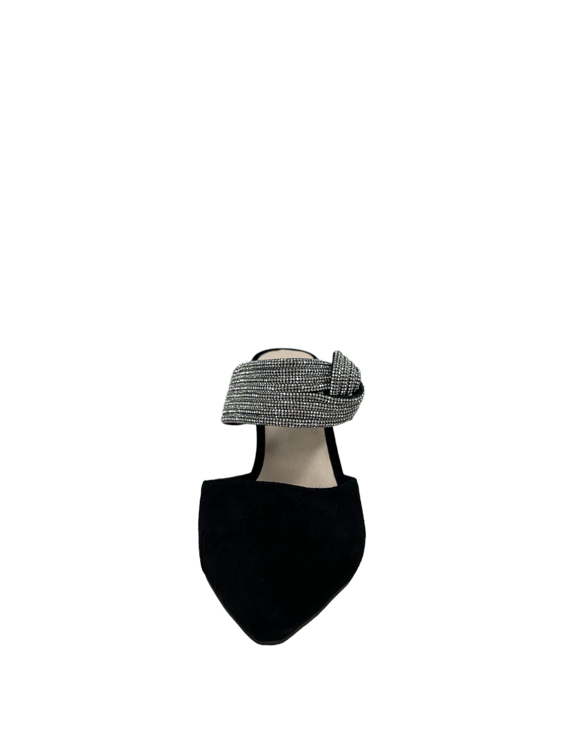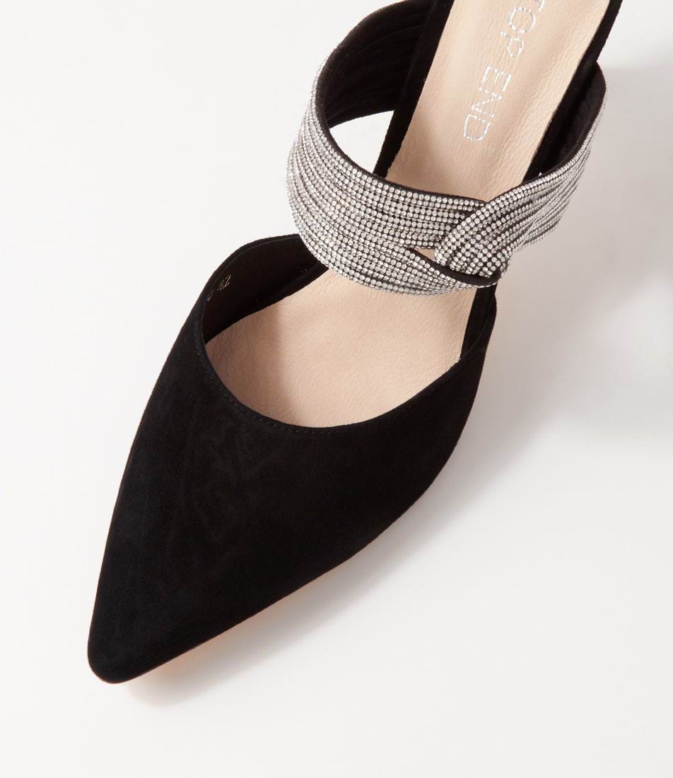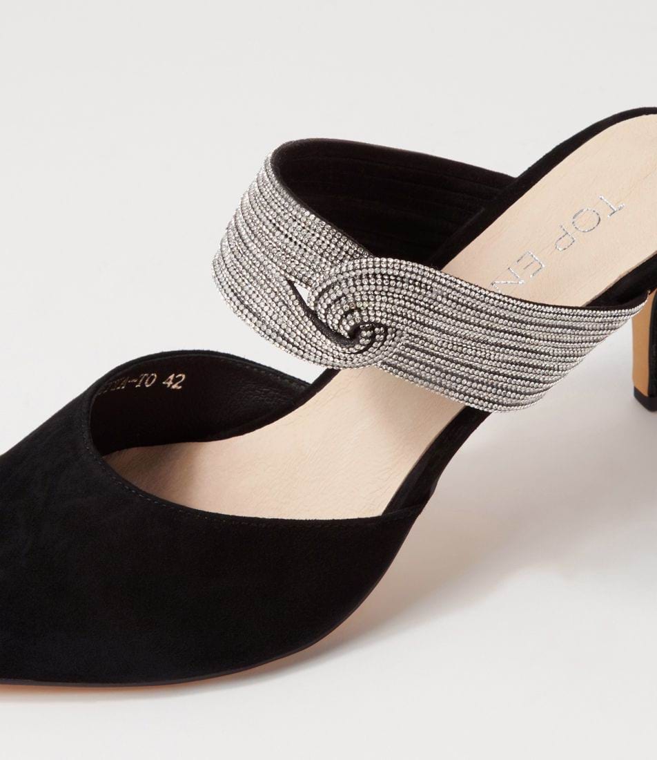 The Barletta Black heeled mules by Top End are the 'It' shoe of this season. This stylish heel features a pointed toe, a rhinestone-encrusted strap and a stiletto heel. These dressy heels are perfect to pull out for your next event paired with everything from a tailored pantsuit to silk slip dresses and jeans and a nice top.