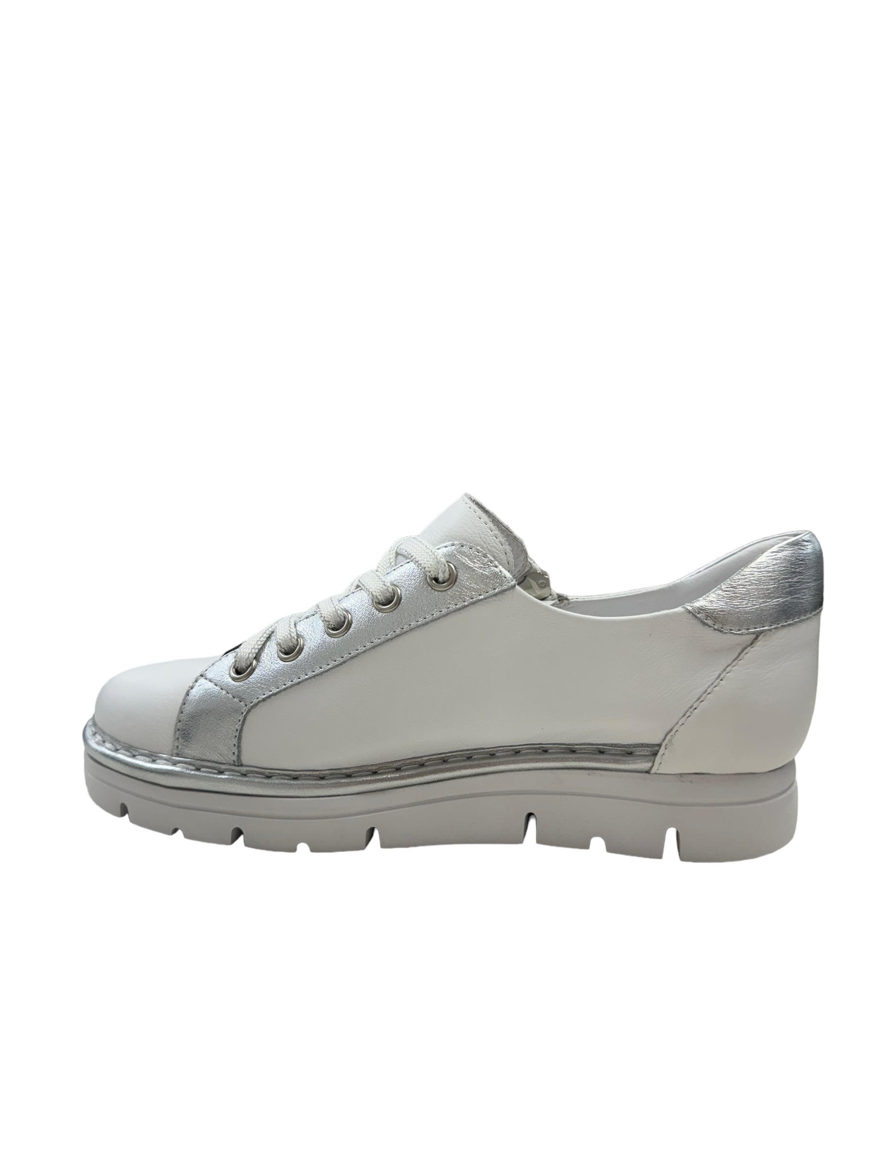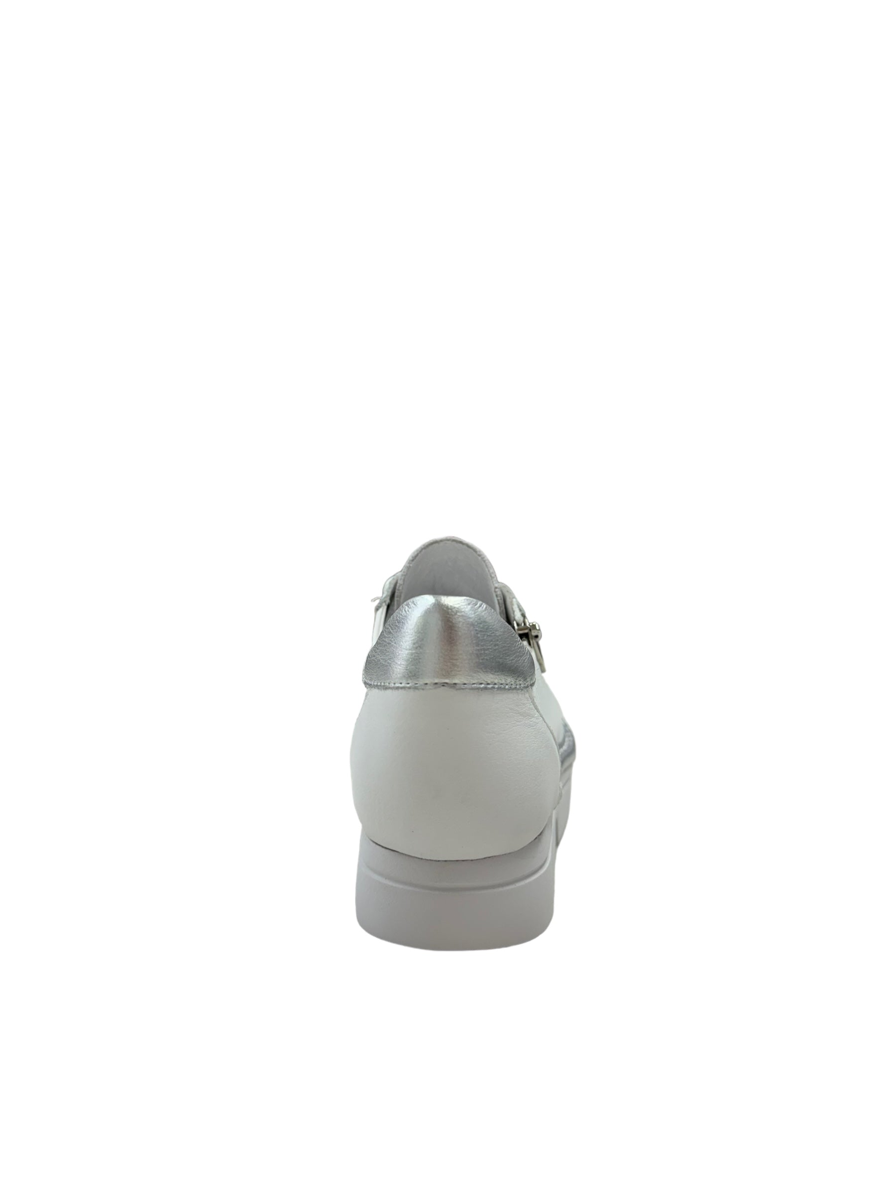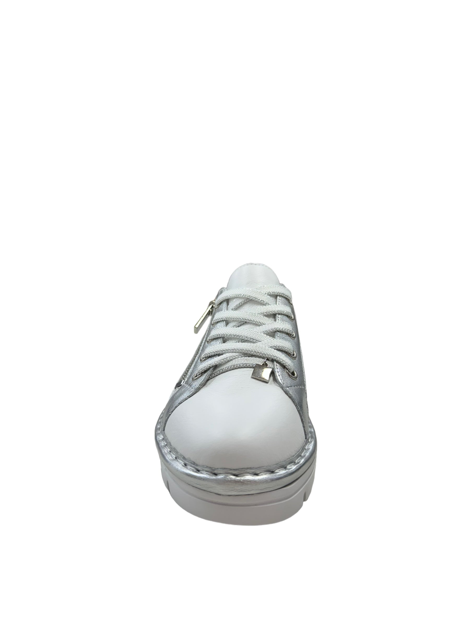 These Elos White / Silver Leather Sneakers are perfect for any casual occasion. The sleek design in white and silver leather adds a touch of elegance, while the rubber sole provides comfort and durability. The side zip entry and elastic laces make it easy to slip on and off, making them a convenient and stylish option for everyday wear.