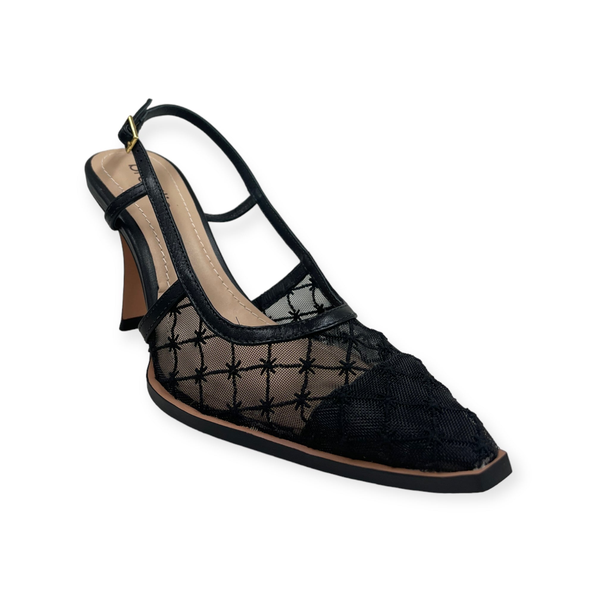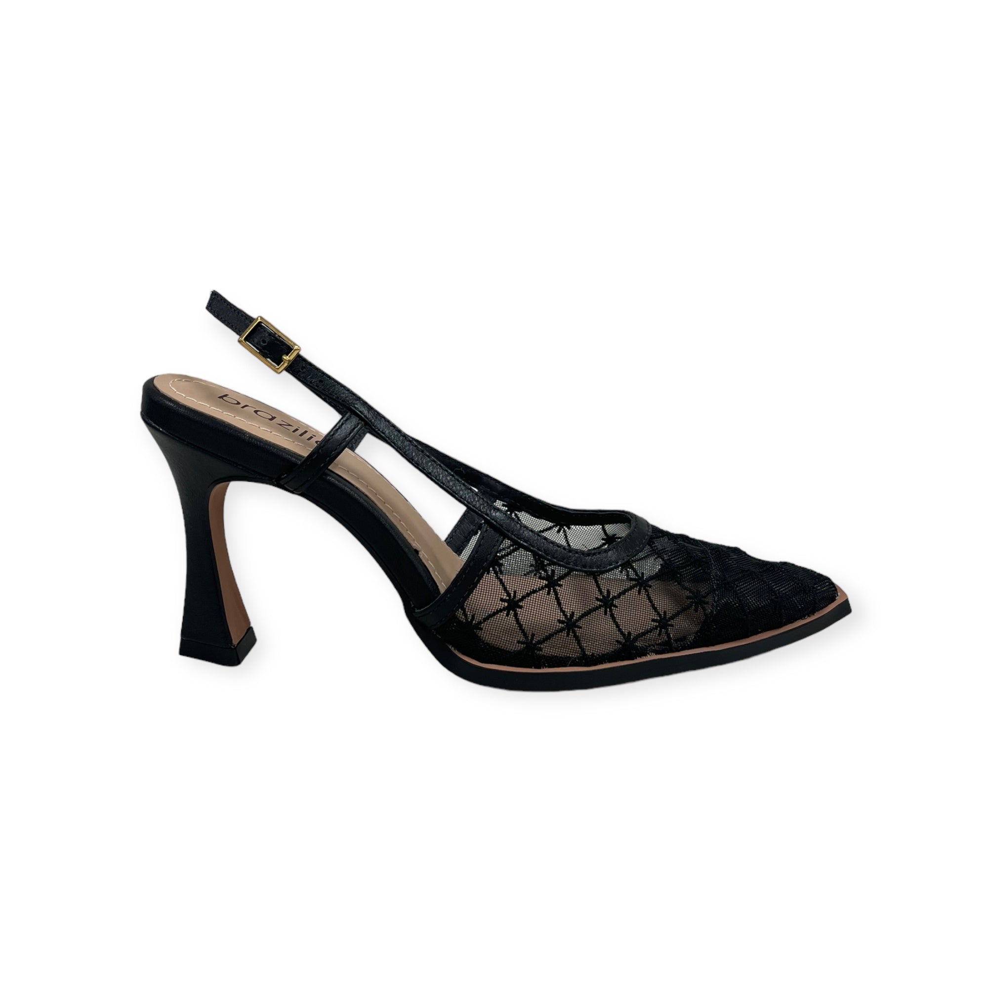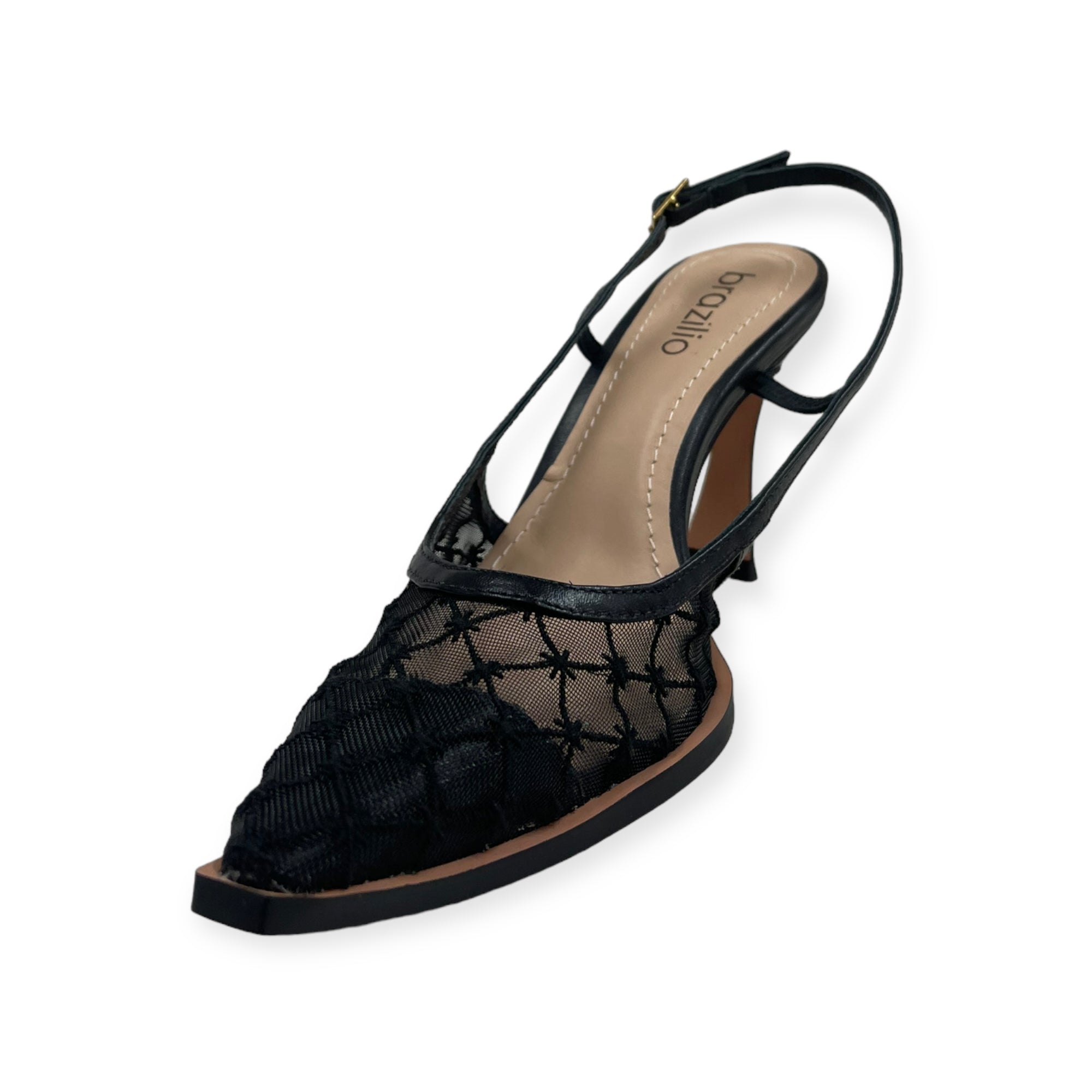 Our Finley Leather sling back provides an elegant and sophisticated look with its leather composition and mesh detailing. Its classic point toe design and sling back closure make it the perfect finishing touch to any stylish outfit. Expertly crafted to be comfortable and timeless, it will become a timeless addition to your wardrobe. Made in Brazil.