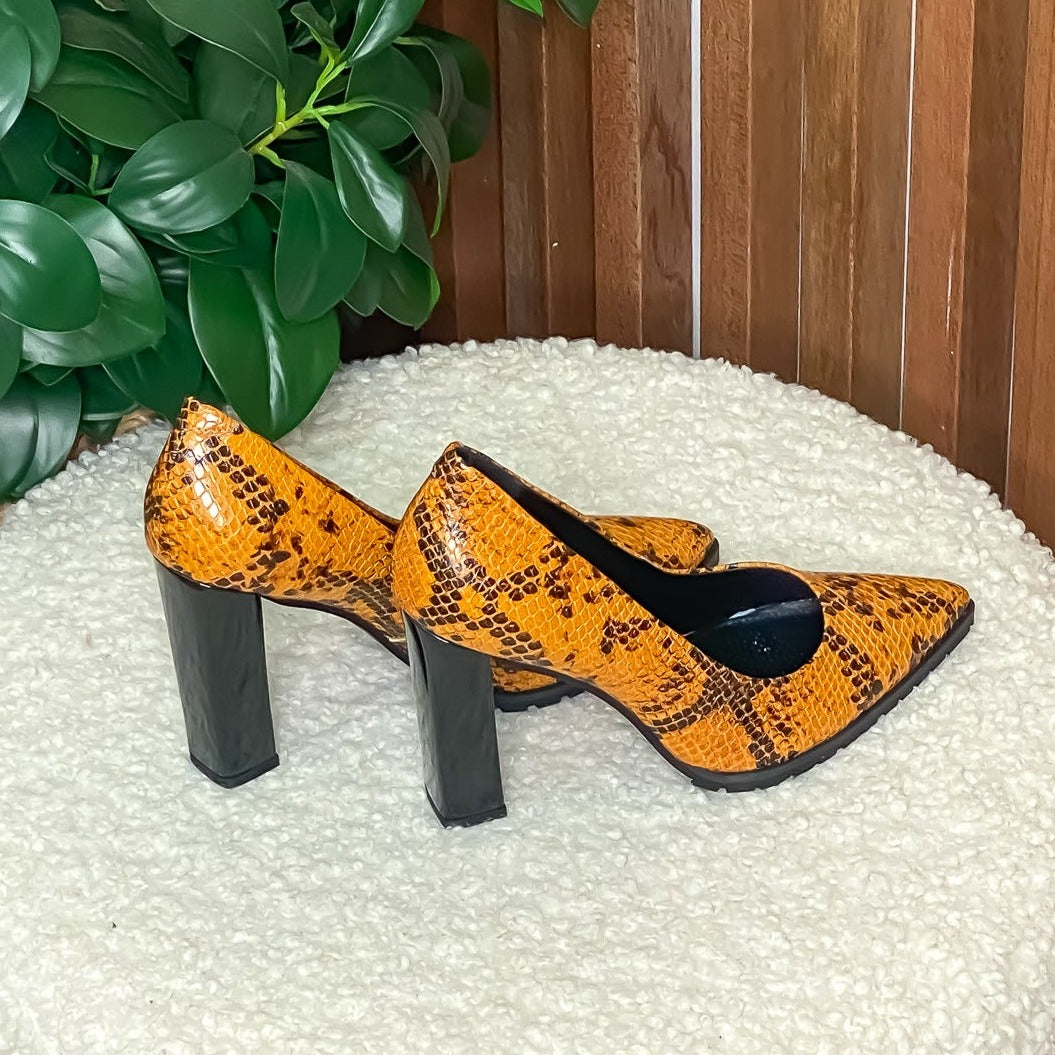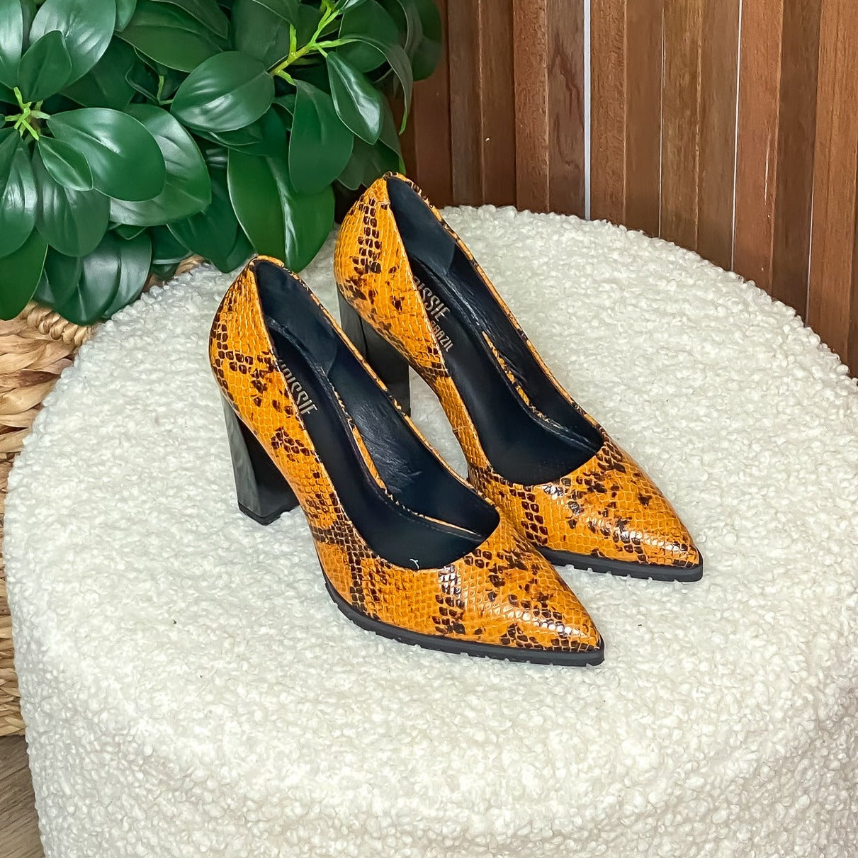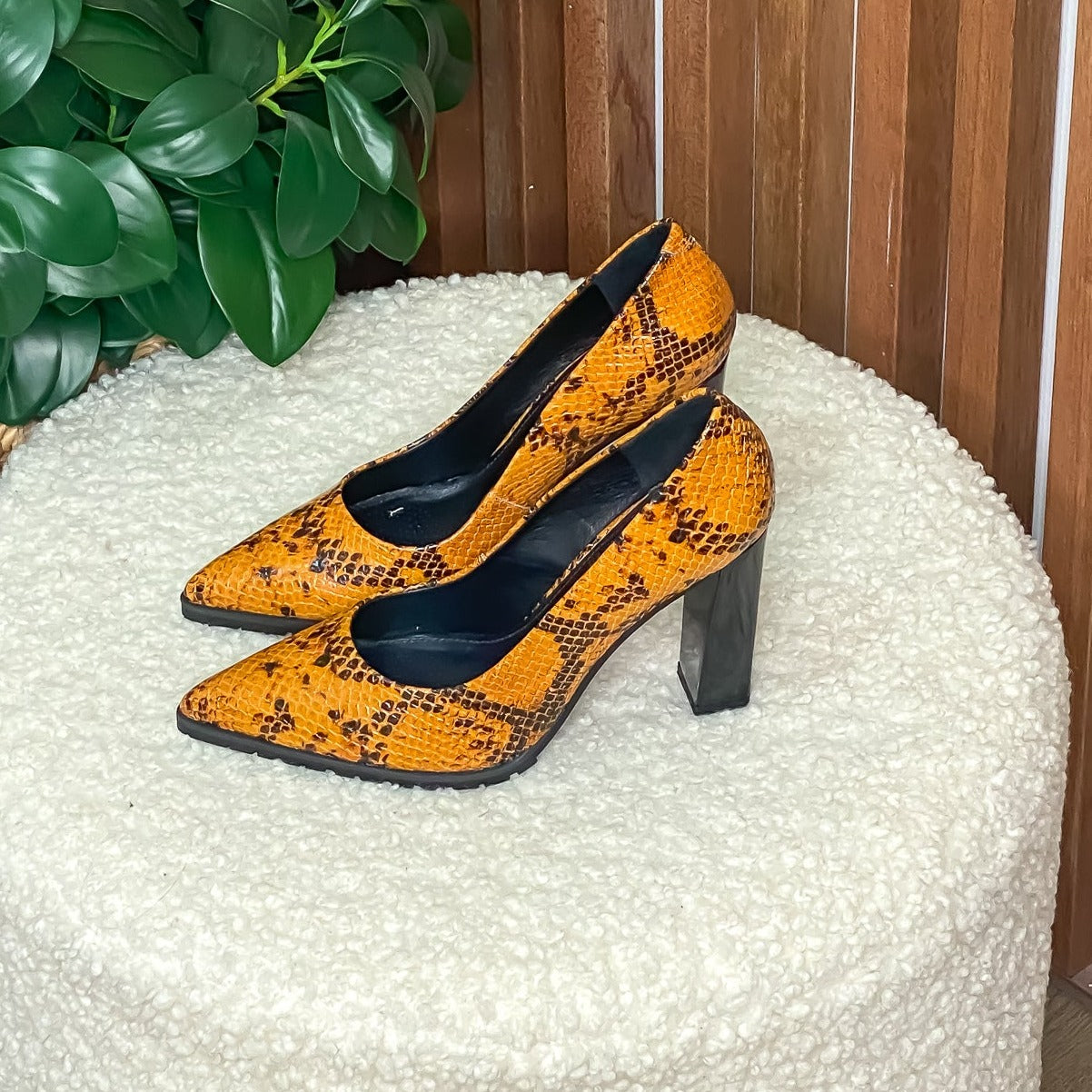 Description: Dressy and elegant closed-toe high heel. Perfect for work or evening wear. A beautiful snake print detail over upper of shoes in a beautiful orange and black mix. Pleated bottom to throw modern style into a classic.
