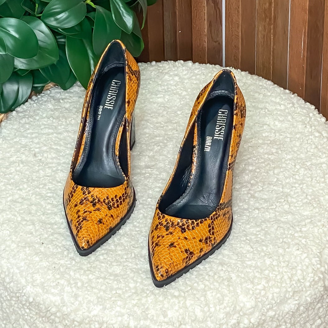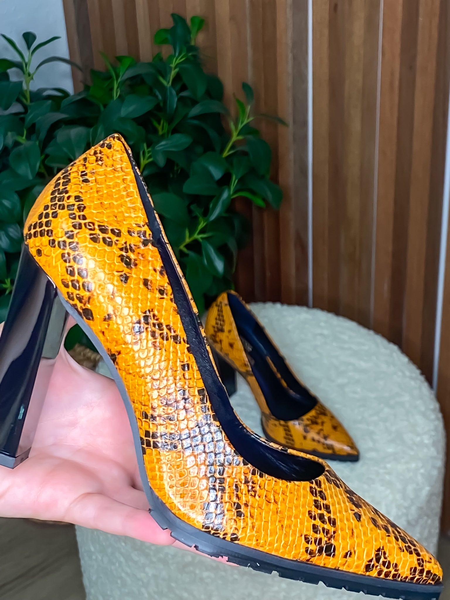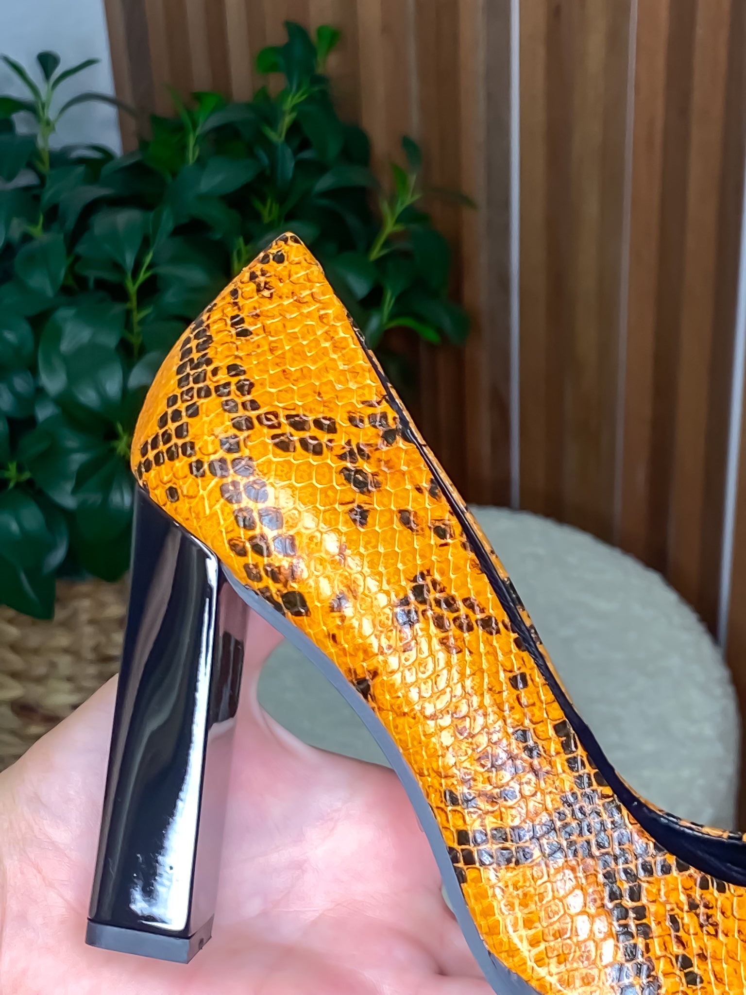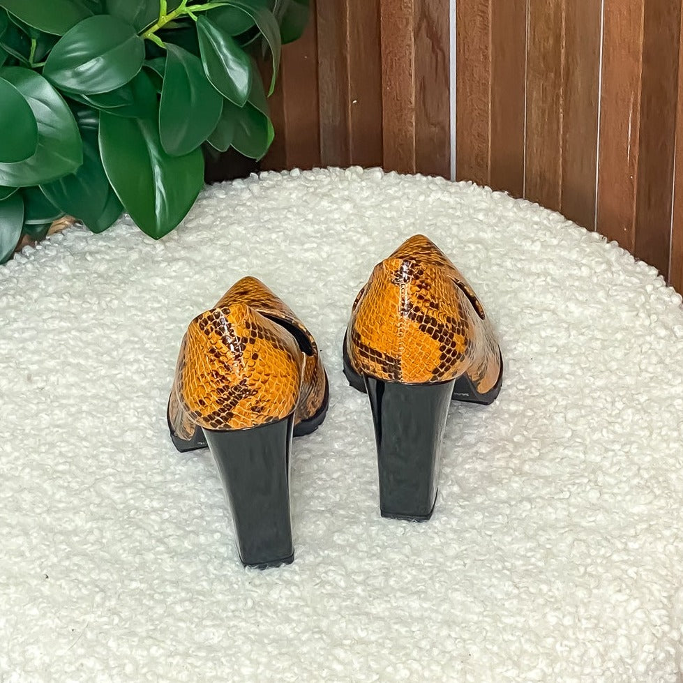 Description: Dressy and elegant closed-toe high heel. Perfect for work or evening wear. A beautiful snake print detail over upper of shoes in a beautiful orange and black mix. Pleated bottom to throw modern style into a classic.