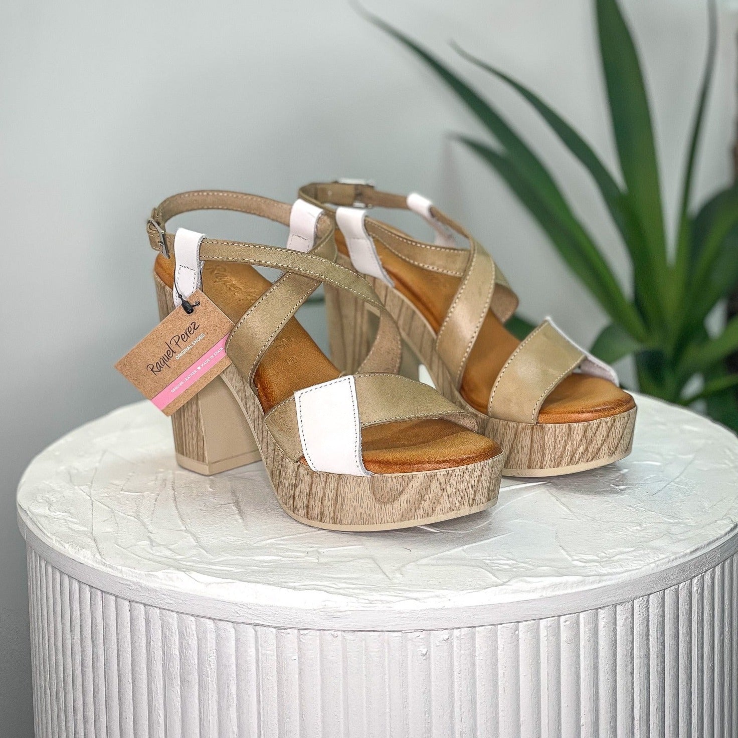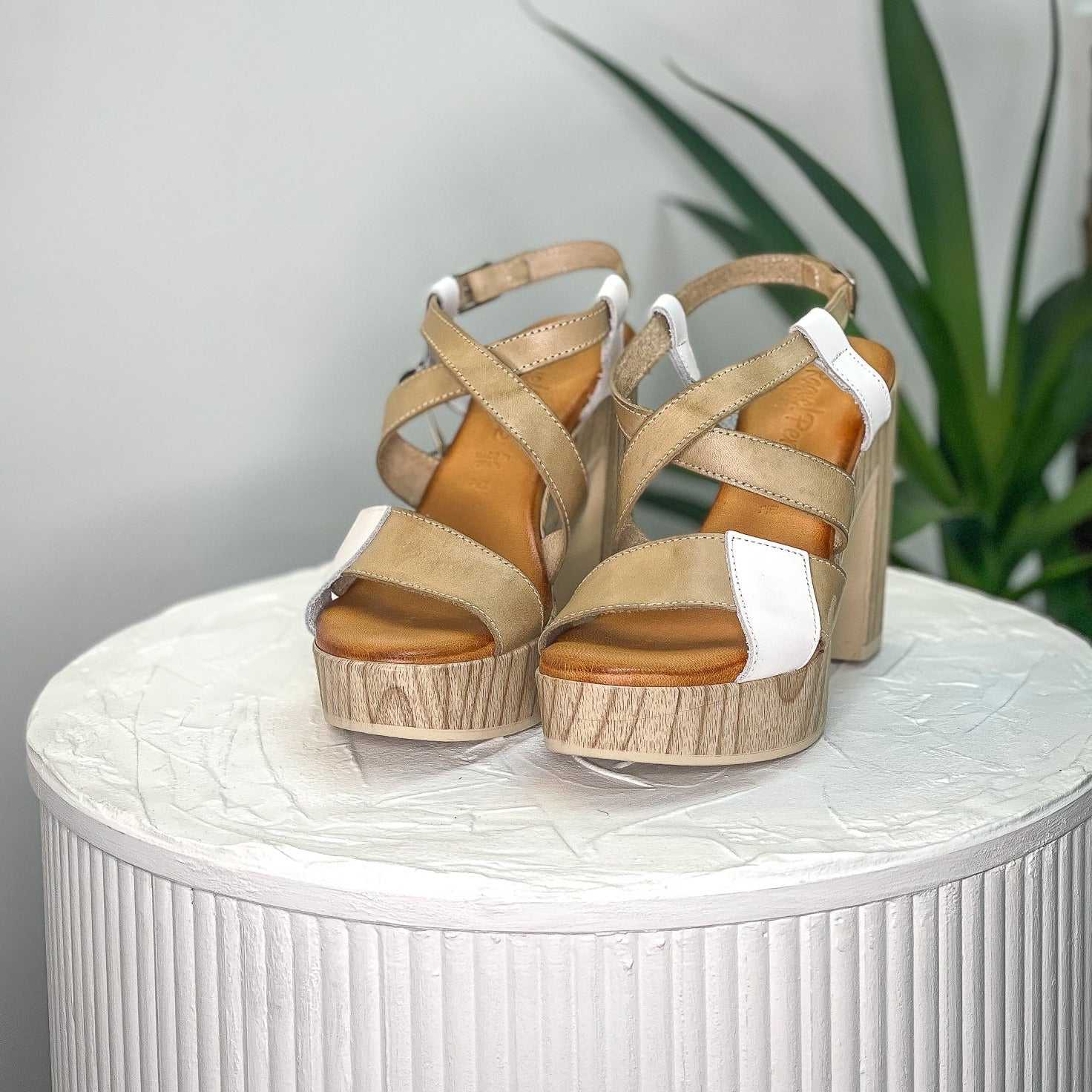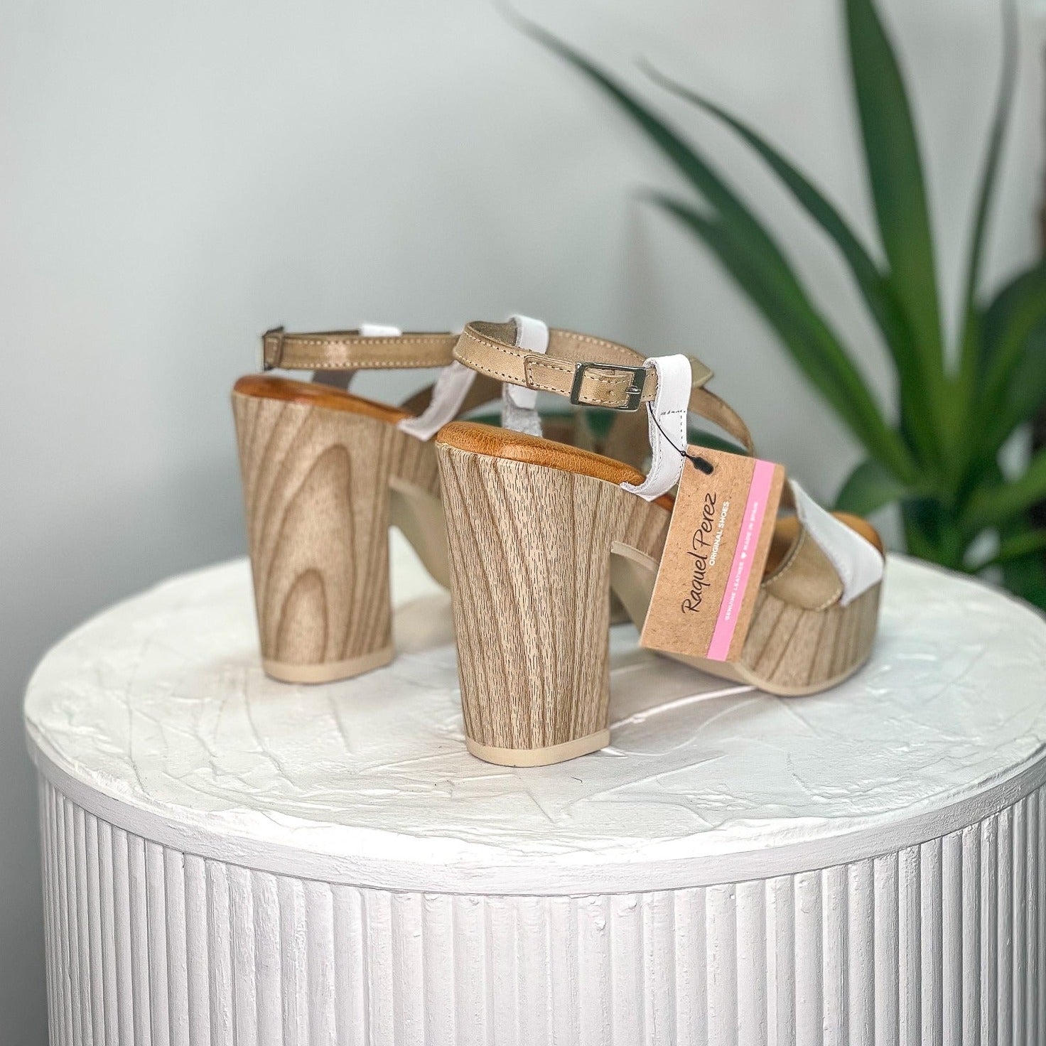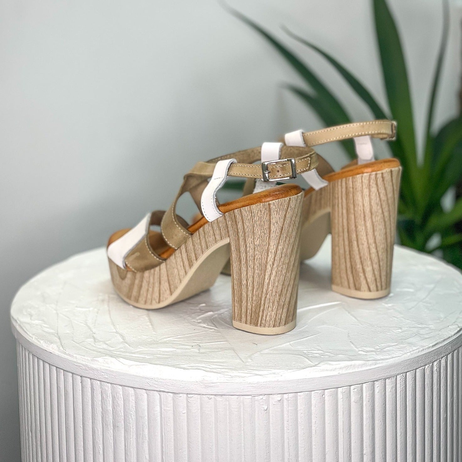The wood look heel contrasted with the crossed multi straps of the Telescopio sandal in natural and white leather is a summer must have. Dress up or down depending on the occasion.