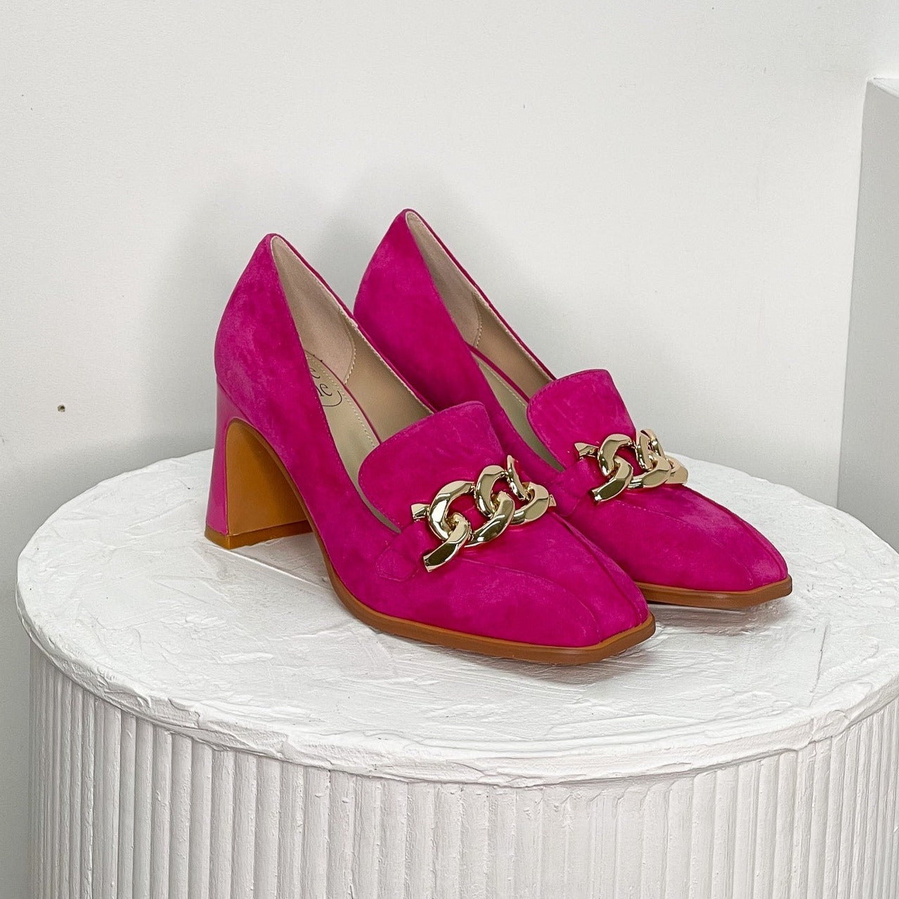 Embrace your daring side with this stunning hot pink Tray! The gold chain detail adds a touch of glamour, while the contrast patent 7cm heel is a true show stopper. Elevate your look and make a statement with this bold, fashion-forward piece. Don't be afraid to take risks and stand out in the crowd!