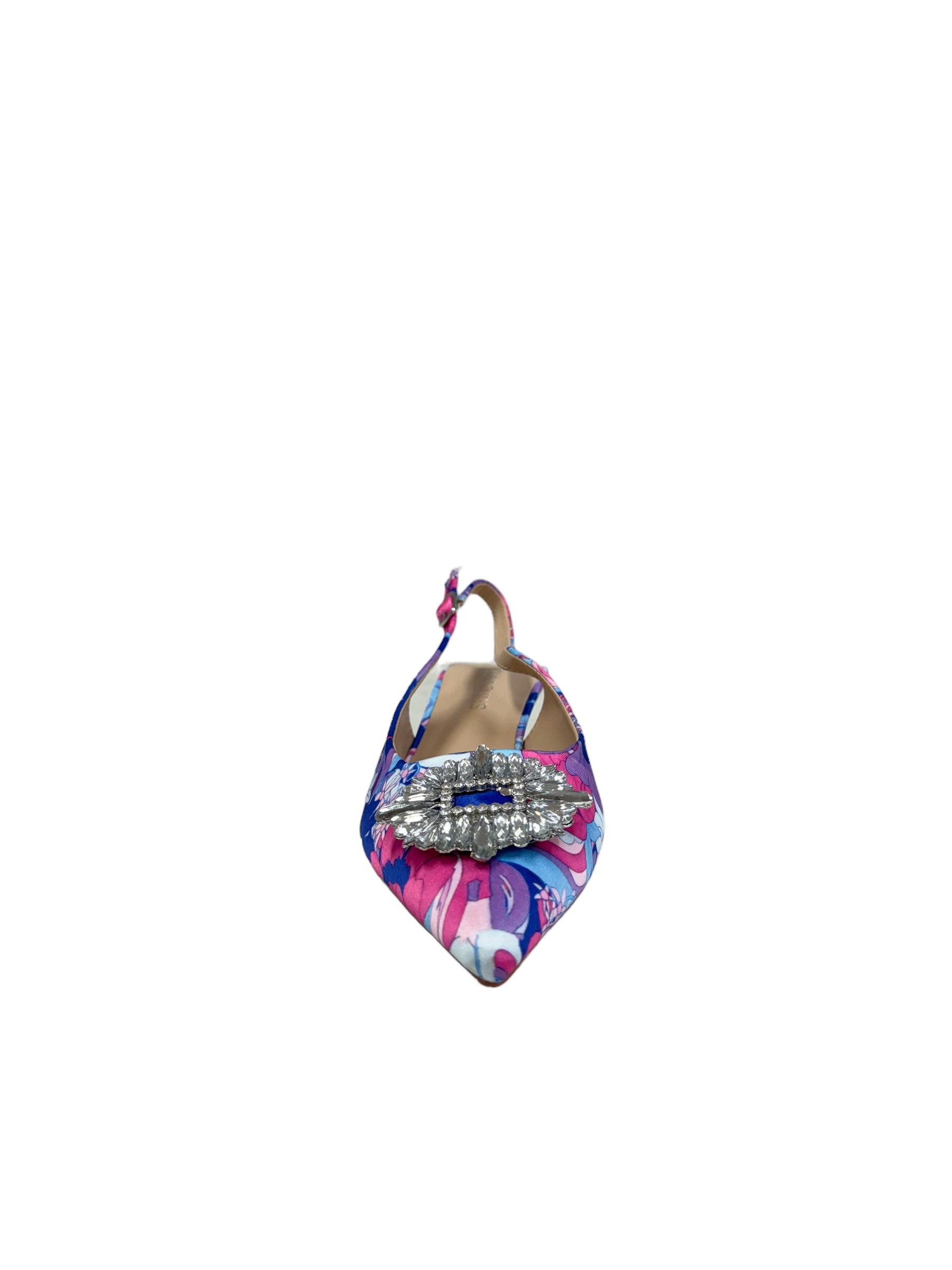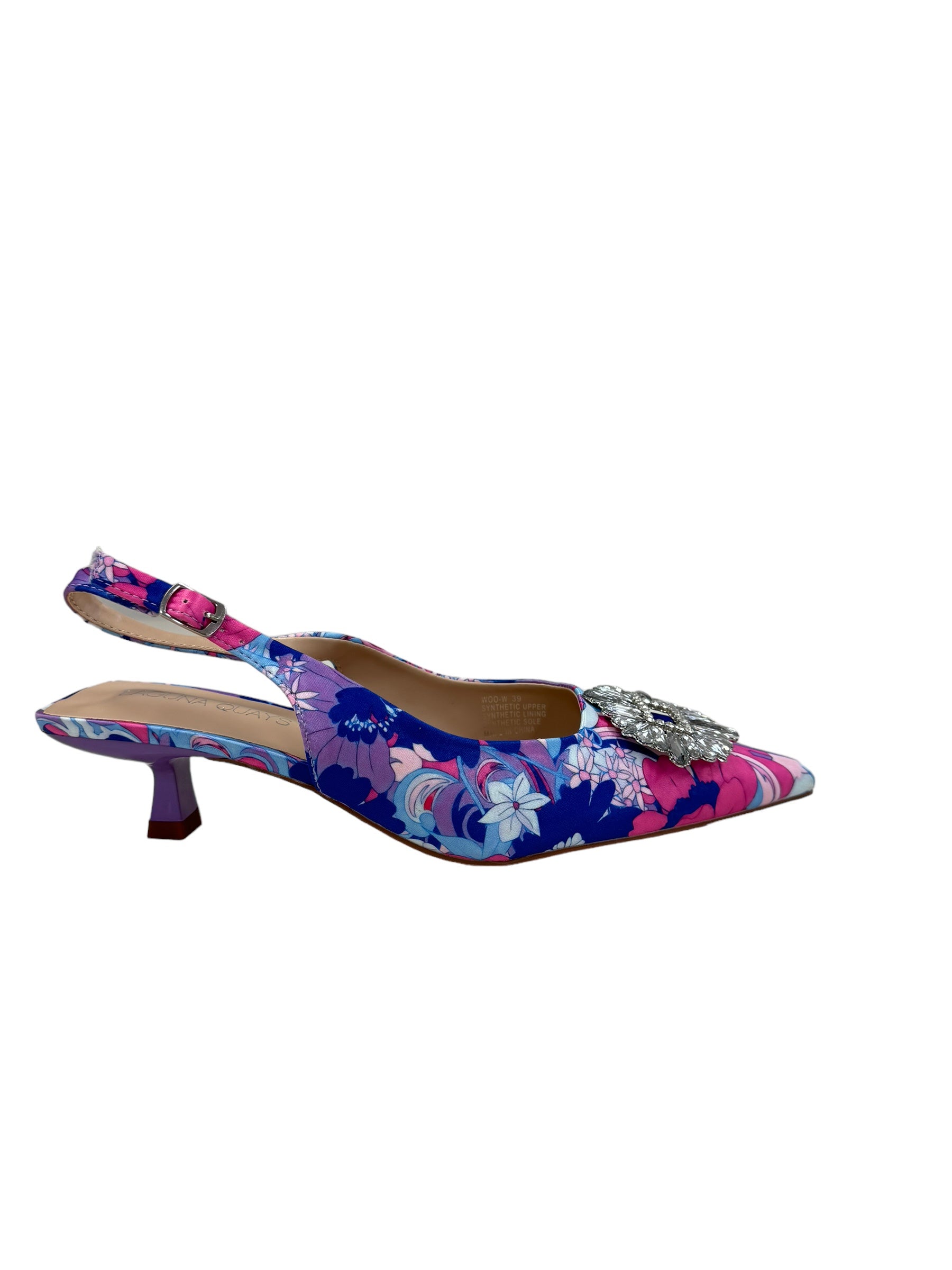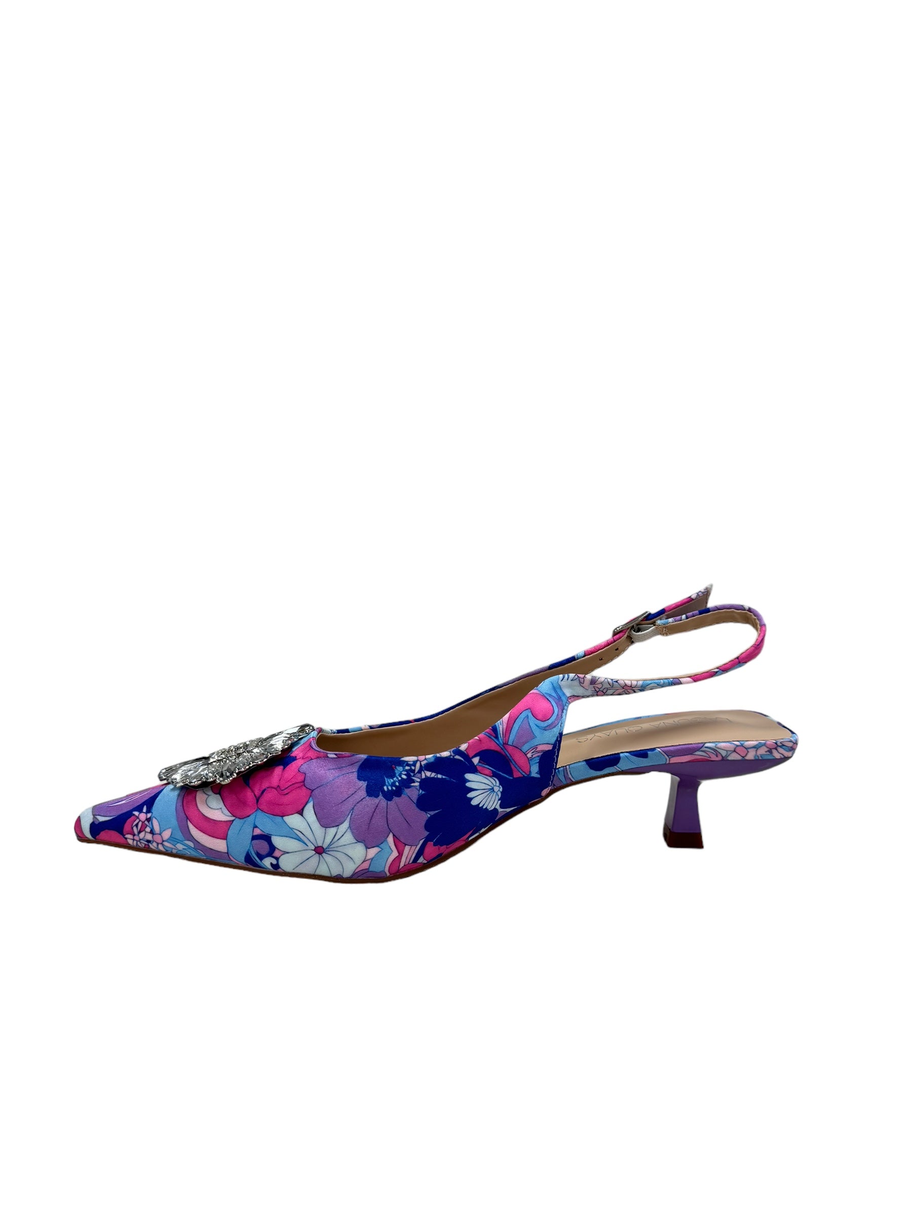 Add a pop of playful color to your outfit with Woo - Purple flower! Featuring a vibrant floral print, comfortable kitten heel, and a statement detail on the toe, these sling back heels are both stylish and fun. Perfect for a day out with friends or a date night. (Warning: may induce shoe envy!)