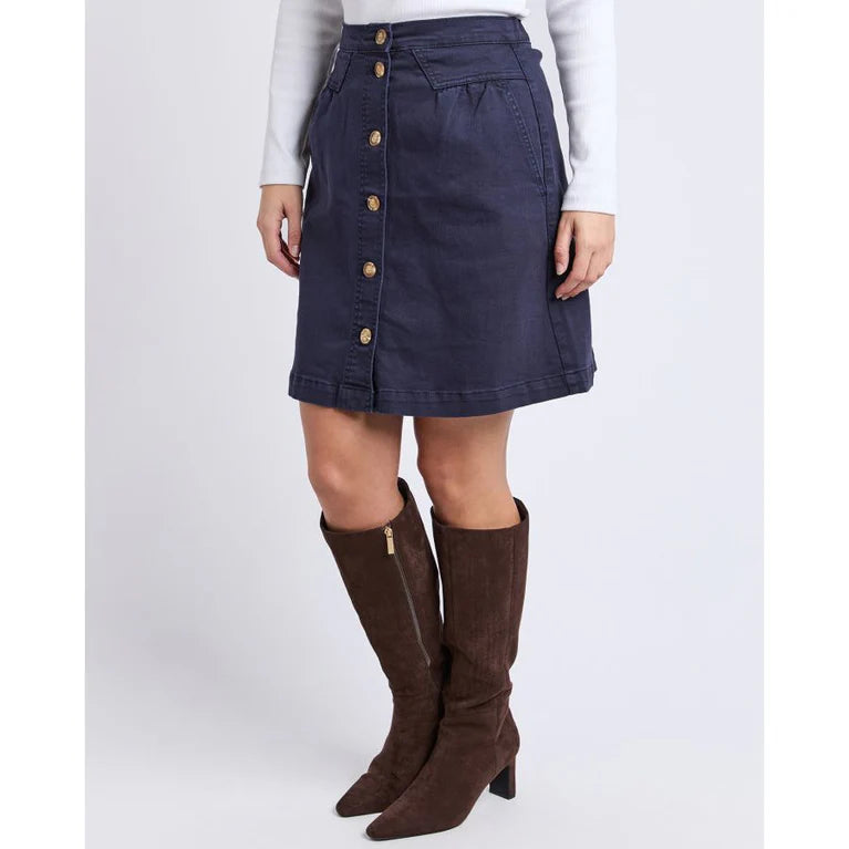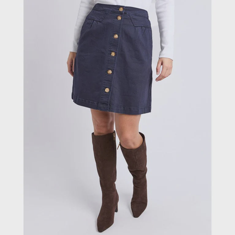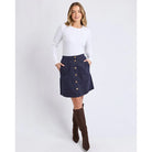 The Amanda Skirt is your new go-to for effortless style. This navy midi skirt features a charming button-through front that adds a touch of personality, while practical side pockets keep your essentials close. Perfect for dressing up or down, it's the versatile piece every wardrobe needs.