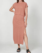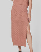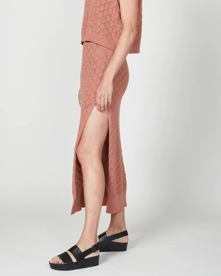 The Palms Knit Skirt in Tan is ideal for those carefree summer days when you just want to slip something on over a swimsuit. This cotton knitted midi skirt boasts a straight fit, an elasticated waistband, and finishes with a ribbed hem. You can wear it over your swimwear or pair it with the matching Palms Knit top for a chic look.