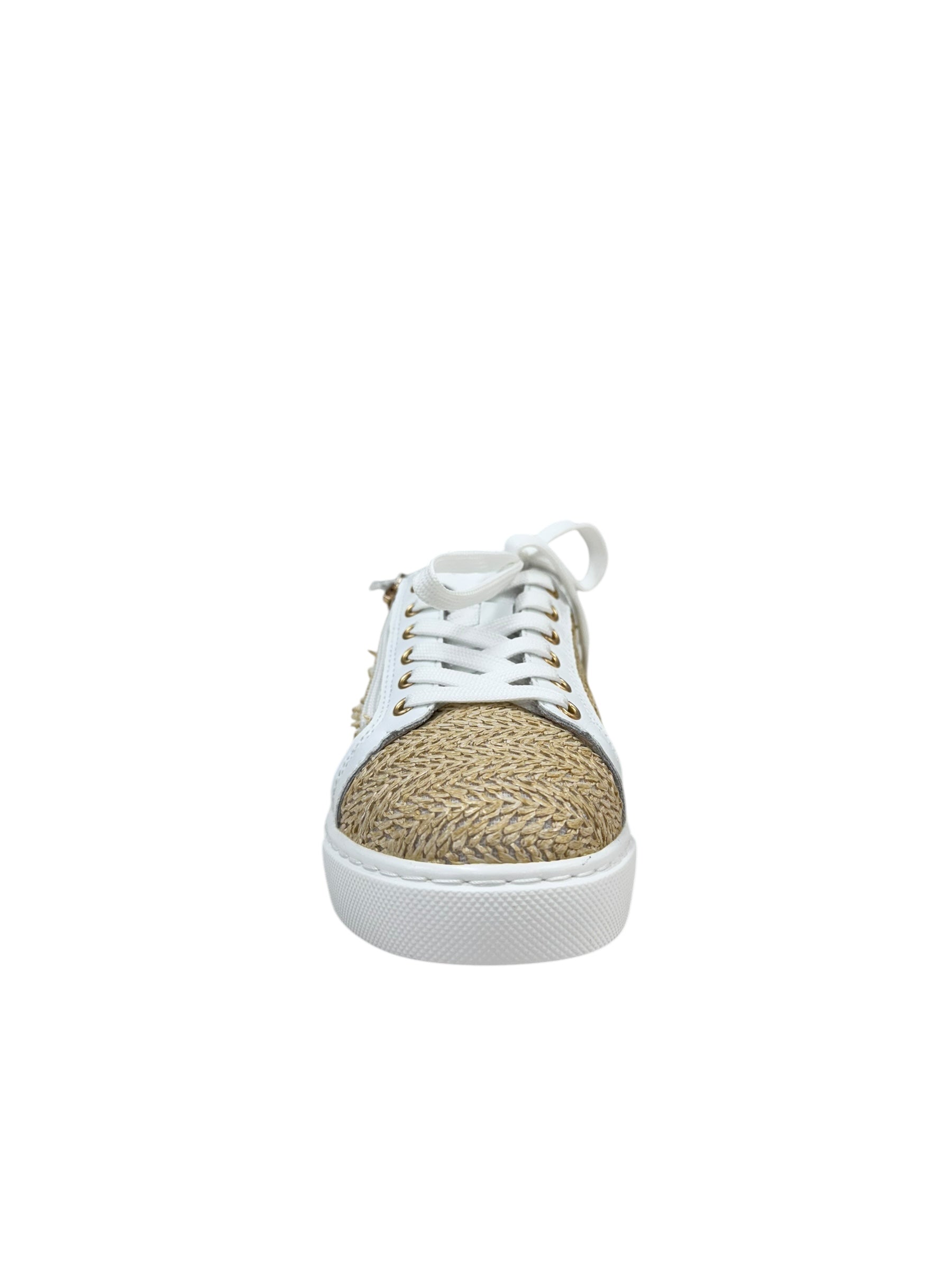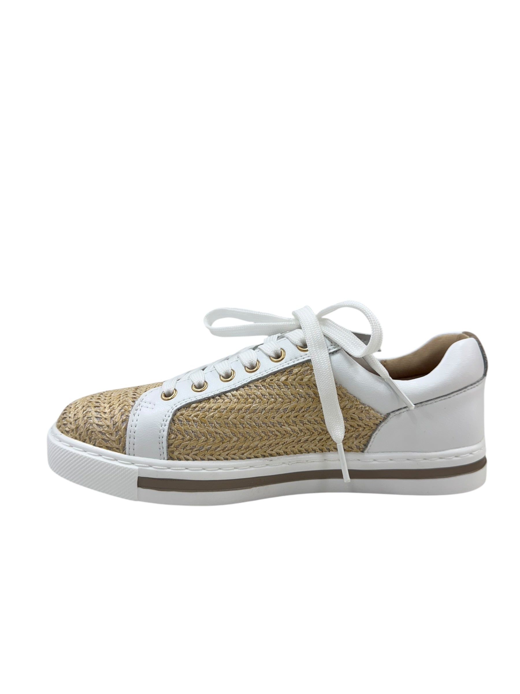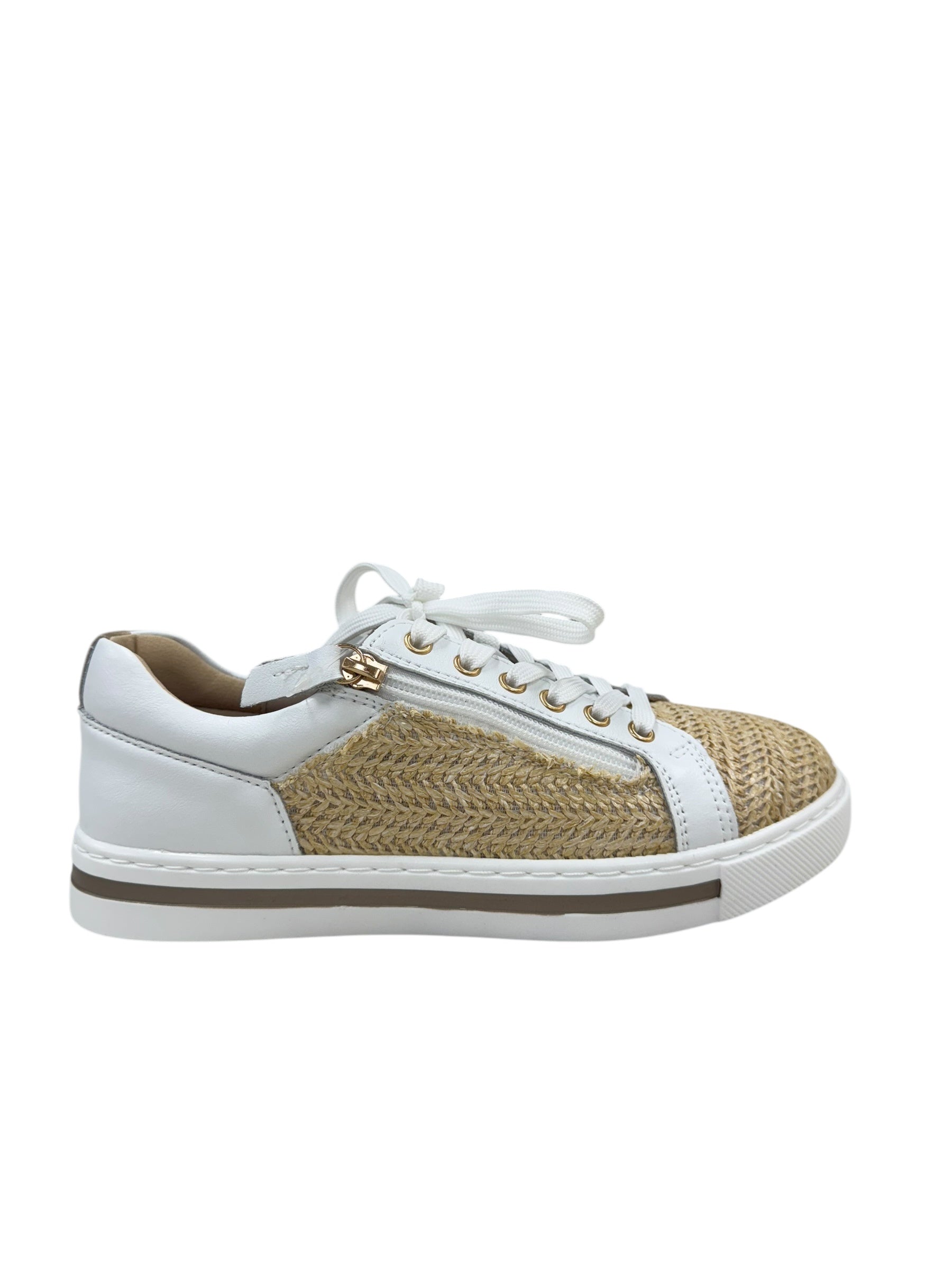 Get ready for summer with Kiki - the perfect white leather sneaker with a natural raffia twist! With lace up and zip entry, these sneakers are not only stylish but also orthotic friendly. Stay comfortable and trendy all season long.