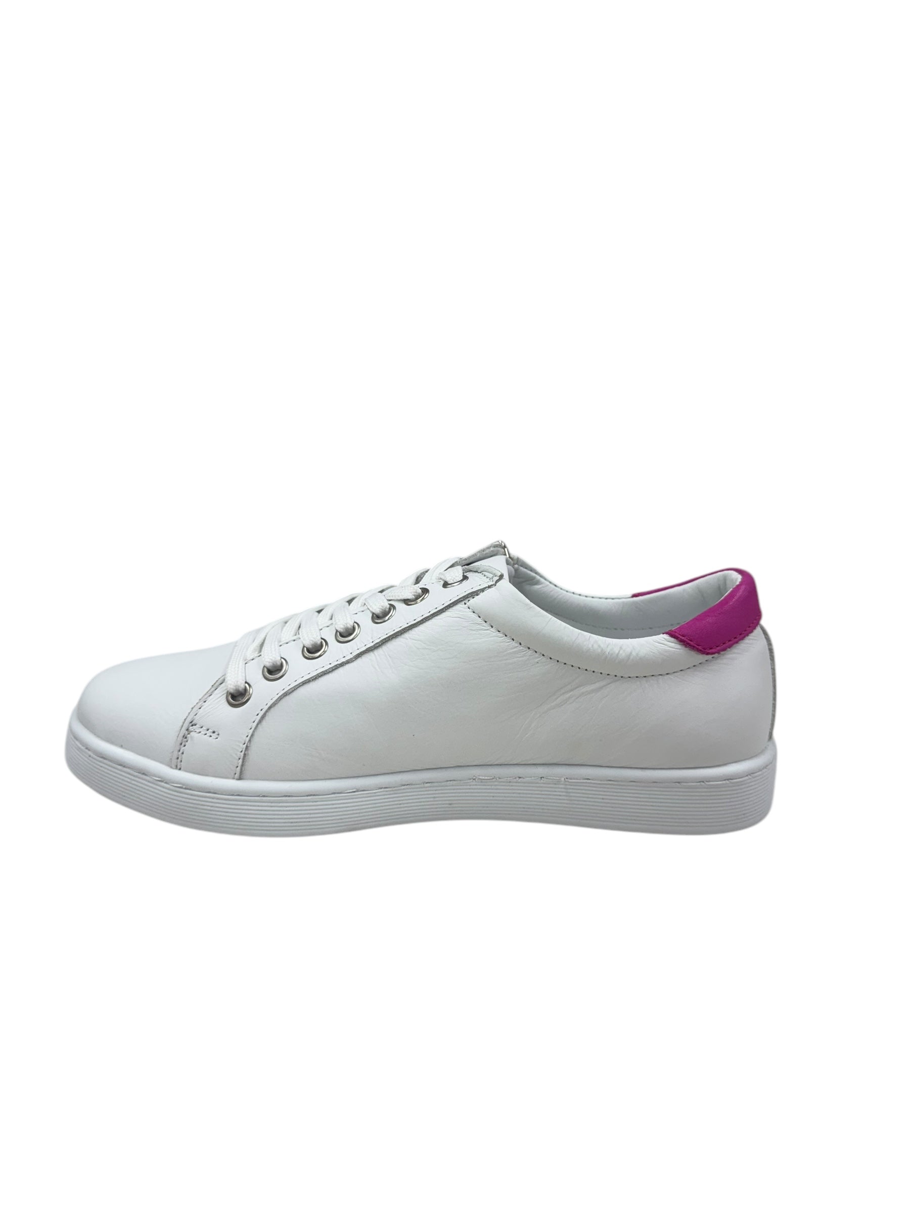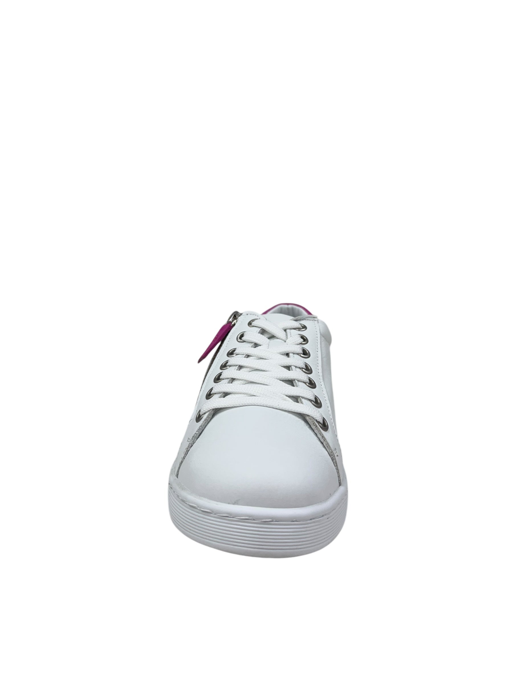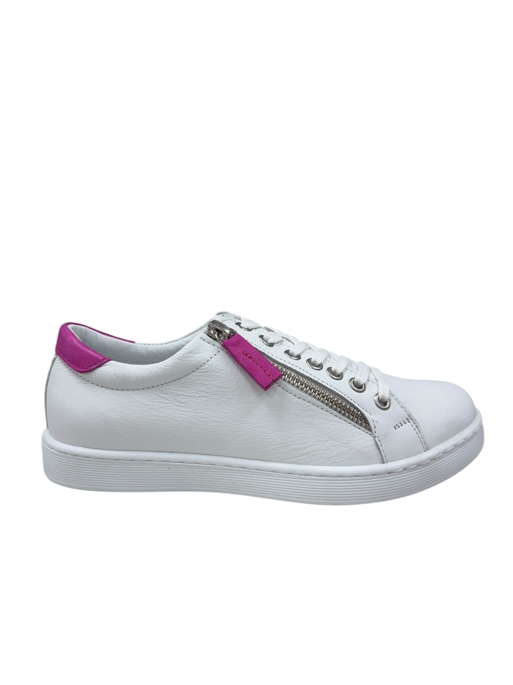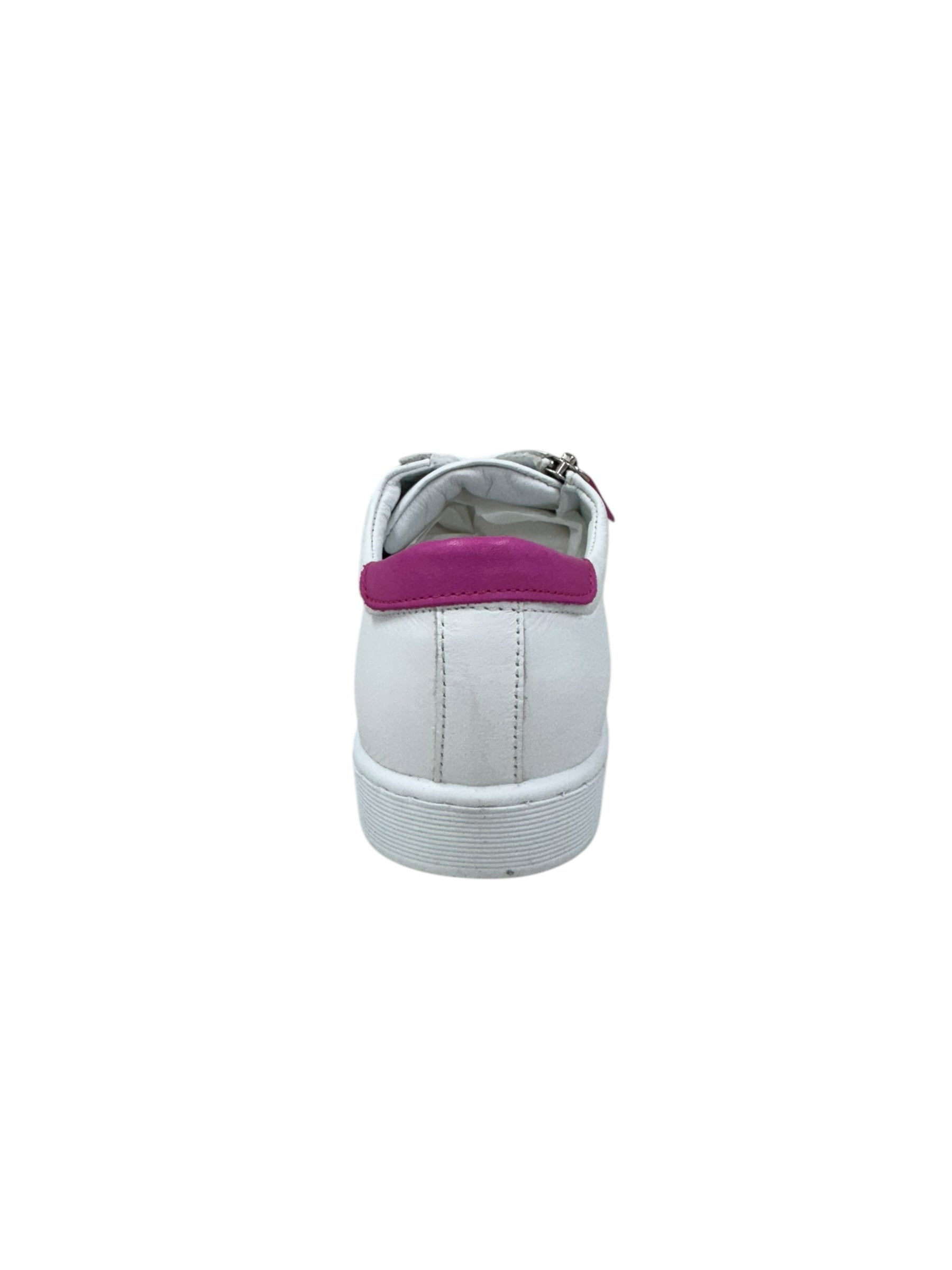 Step up your sneaker game with Token Fresh! These white leather sneakers not only make a statement with hot pink trims, but also offer convenience with a zip entry and lace closure. Made in Europe, these sneakers are stylish and functional for any occasion (and don't forget about the added bonus of European craftsmanship)!