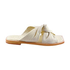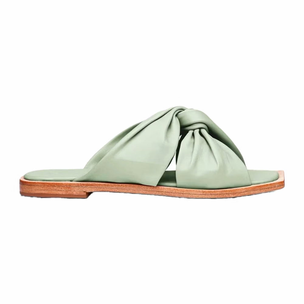 The open back Elise slide features a modern square toe and raised leather inset sole. A thick strap of butter soft green leather twist together to create gentle ruching and finish with an elegant knot detail on the top of the foot.