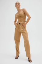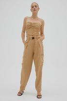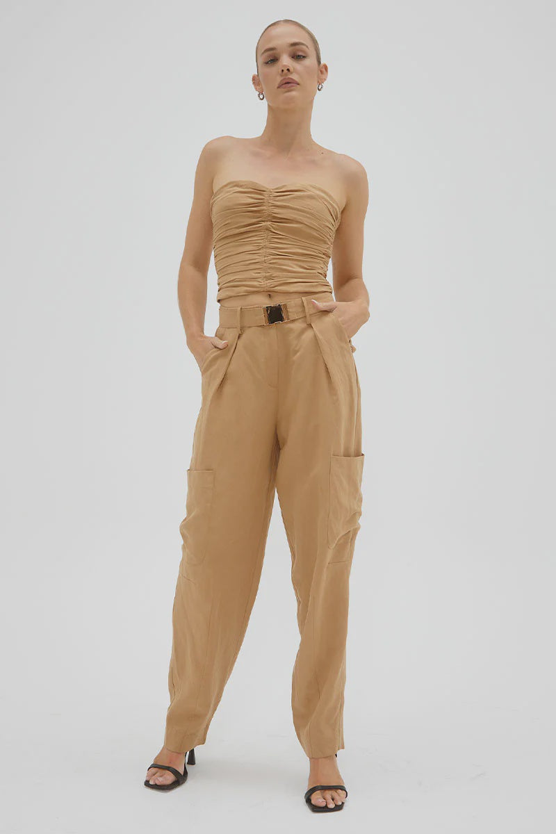 The Nouvelle Cargo Pant is crafted from a luxurious and breathable linen-blend fabric. Featuring a relaxed fit and tapered leg with darting for a flattering shape, the pant is detailed with functional front hip pockets, side leg cargo patch pockets, and a removable matching fabric belt with a gold clip buckle.