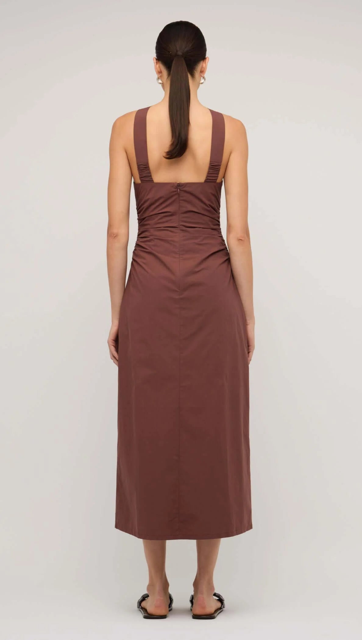 The Ishtar Brown Cotton Bead Halter-Neck Ruched Midi Dress is an effortlessly elegant silhouette, crafted from 100% cotton in a rich chocolate brown tone. Featuring a halter neckline with a front ring detail, ruched bodice, and fitted waist, it falls to a sleek A-line midi skirt for a flattering finish. Perfect for both day events and evening occasions, this dress offers versatile styling that can be elevated with heels or dressed down with sandals.