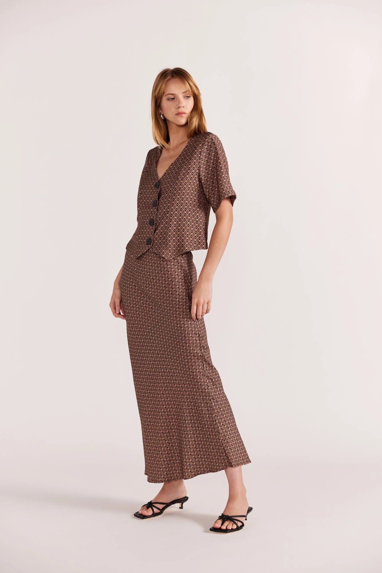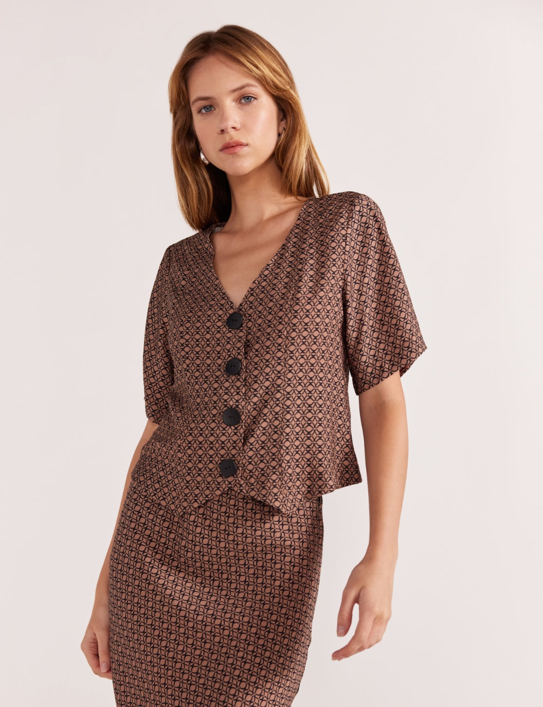 Looking for a top that will make a statement? Look no further than our Memoir Button Front Top! With its playful pattern and quirky button up design, this top is anything but ordinary. Want to complete the look? We also offer a matching skirt for a fun and coordinated outfit.