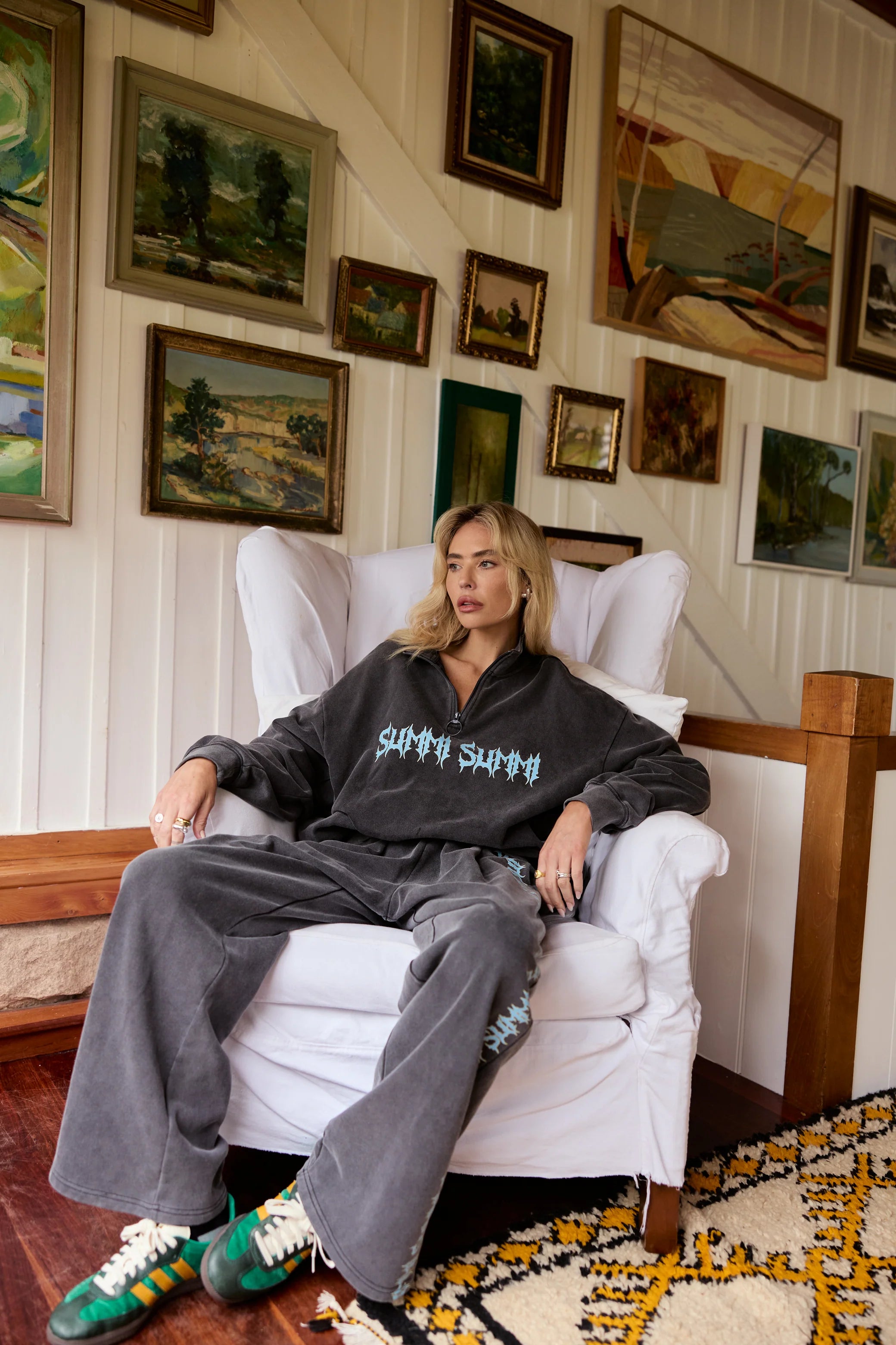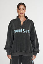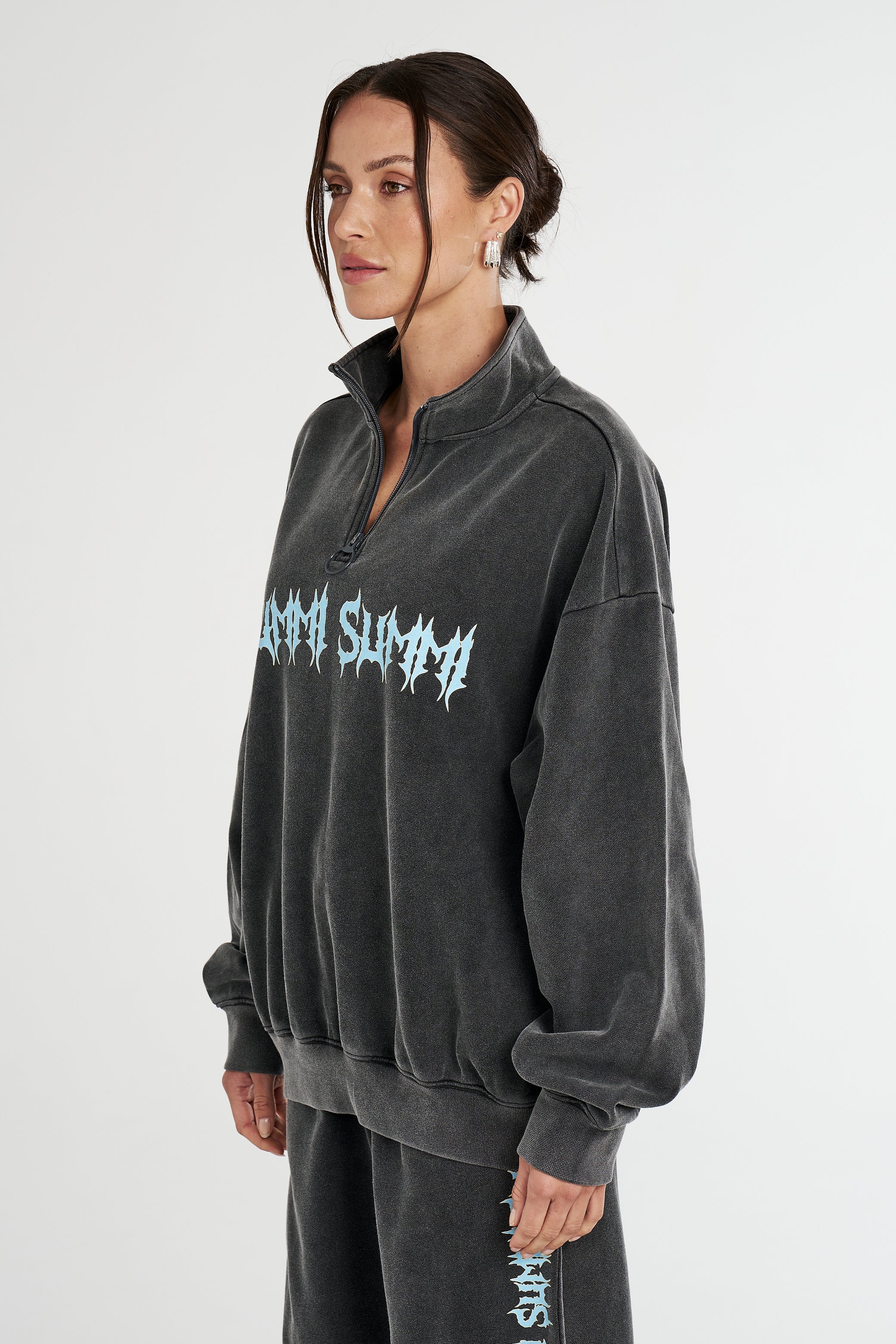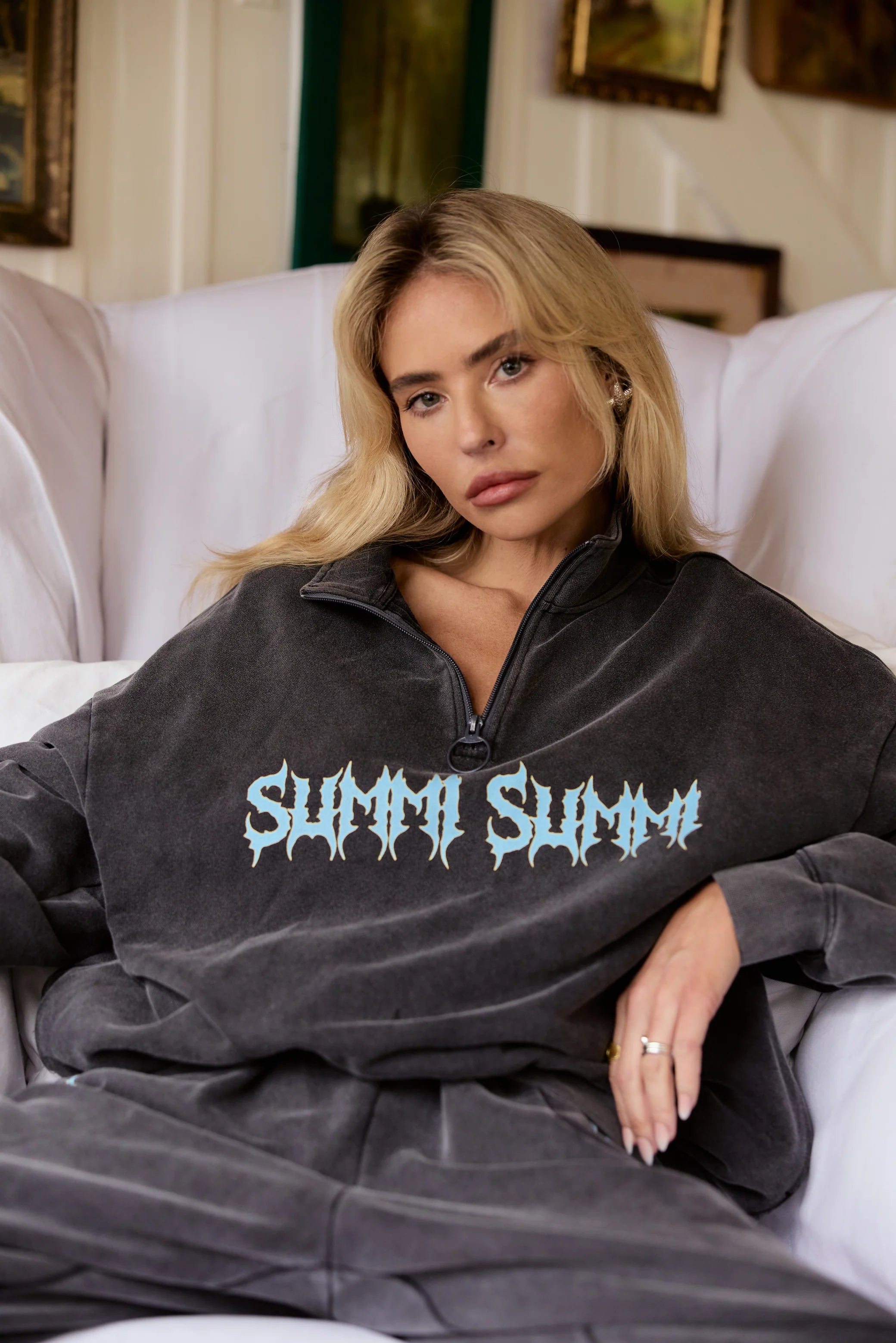 The Zip Neck jumper is a classic oversized fit designed to be gender neutral. Made from 100% cotton French terry in a Washed Vintage Black. Featuring a zip neck line and elongated relaxed shoulders with insane Summi Summi branding across the front.