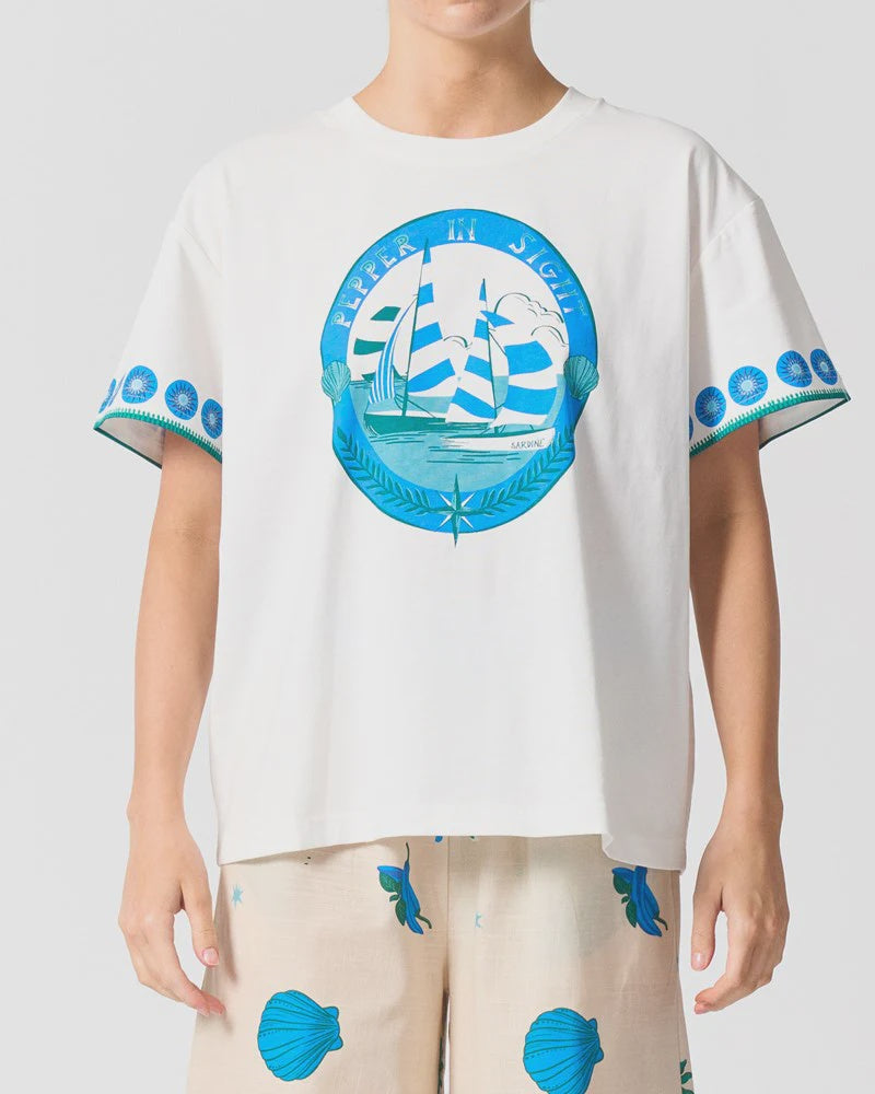 Channel your inner sailor with the Lison tee in Andiamo. Designed with a nautical crest and bold blue details, it brings a classic maritime mood with a modern twist. Finished with contrast sleeve detailing for a touch of polish.