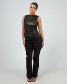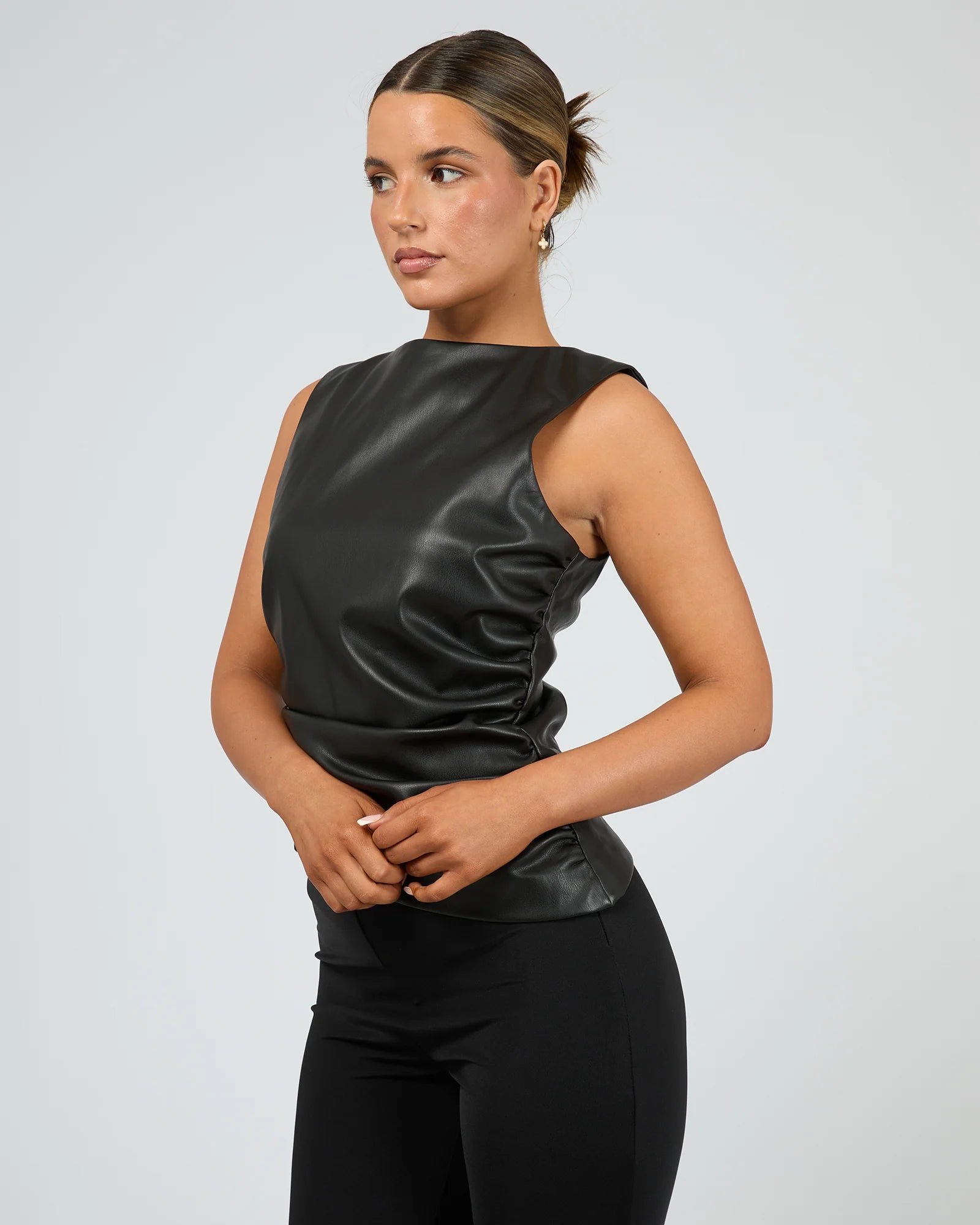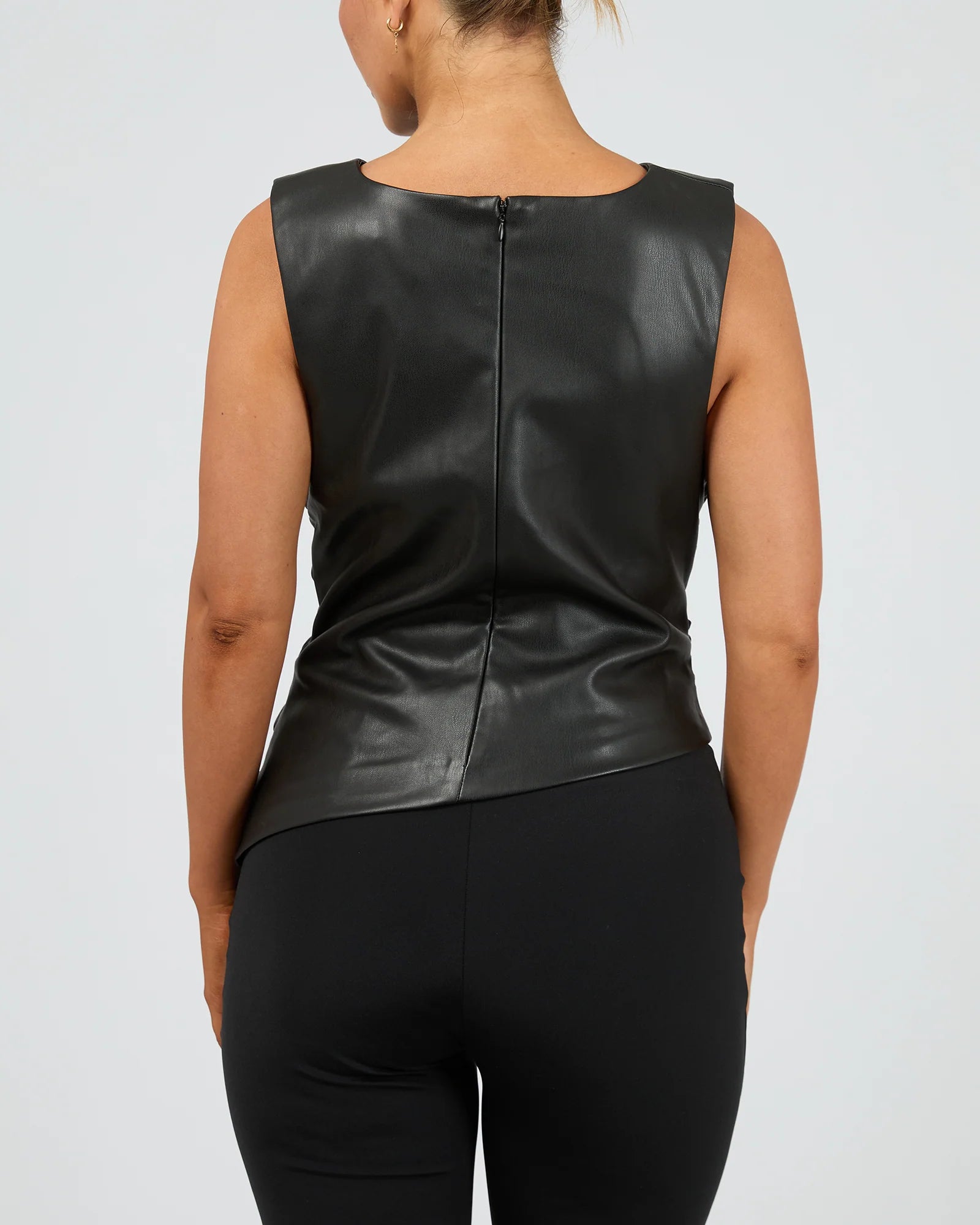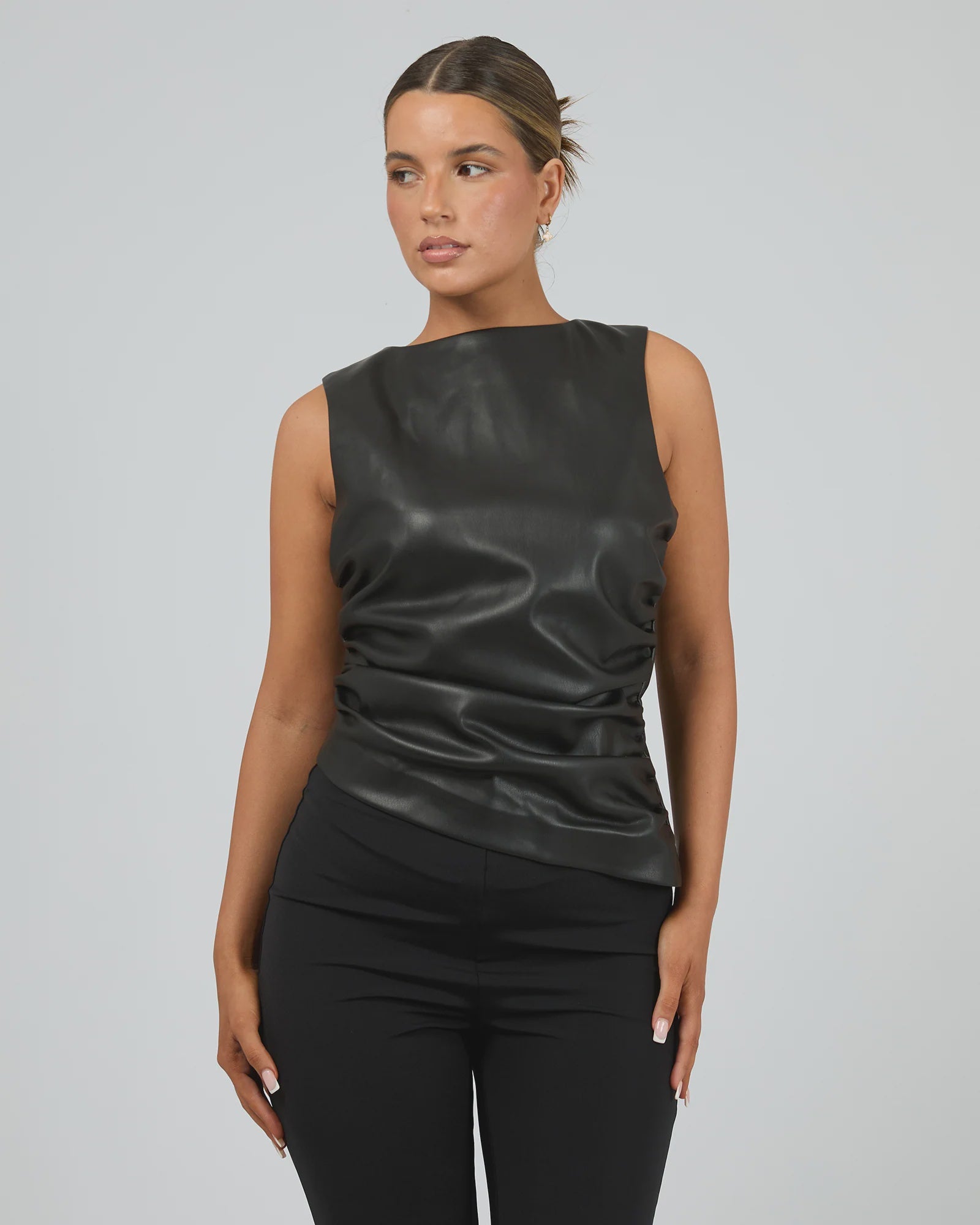 The Liv Rouched Top is a show-stopping piece designed to flatter and turn heads. Crafted from thick, high-quality PU with a luxe faux leather look, this fully lined top features a high scoop neckline and a wide-cut shoulder for a subtle cap sleeve effect. Generous ruching down the side seams creates a figure-enhancing, svelte silhouette, while the asymmetrical hemline adds modern edge. An invisible zip at the back ensures a sleek finish. This top is as versatile as it is striking—perfect for year-round styling and easily refreshed with a cold hand wash. A timeless staple for elevated wardrobes.