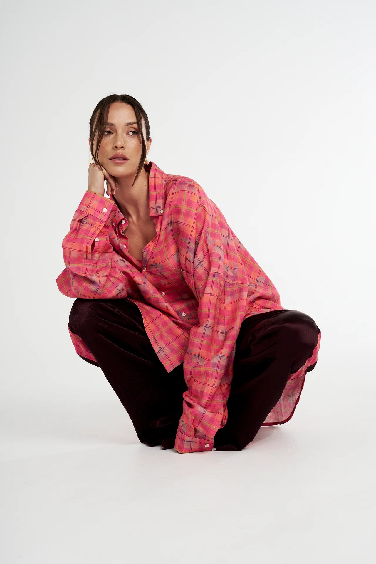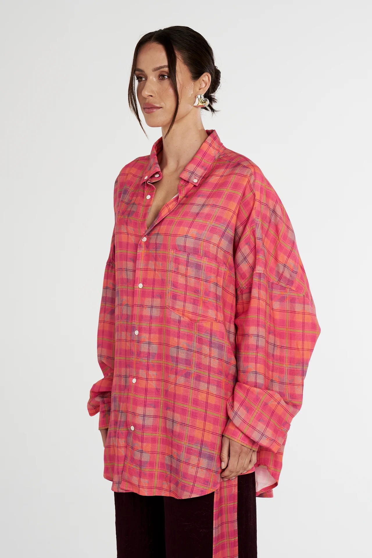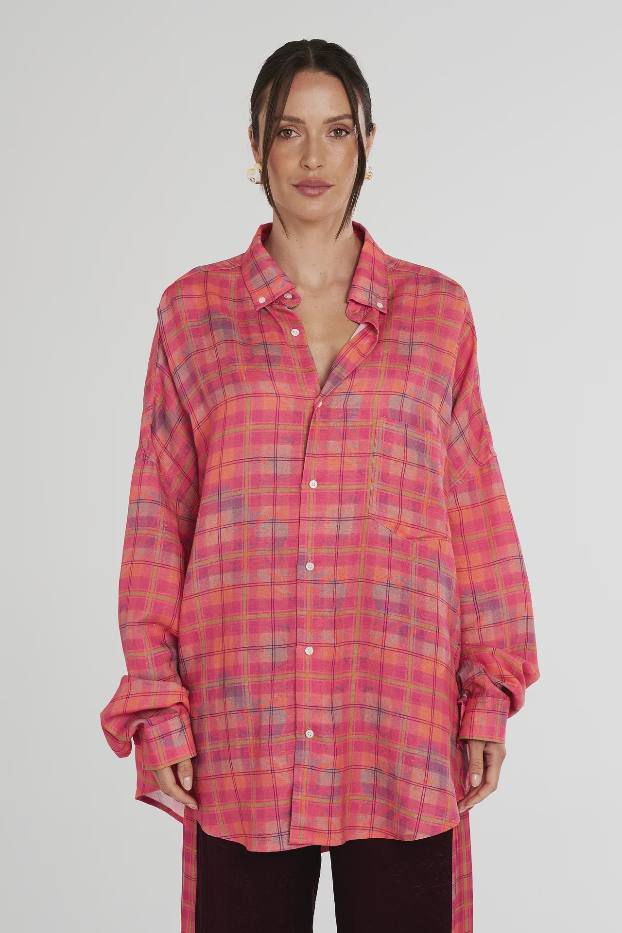 The LS Oversized Shirt featuring the hand-painted Neon Plaid print has been expertly crafted offering a structured yet relaxed fit with cuffed sleeves.