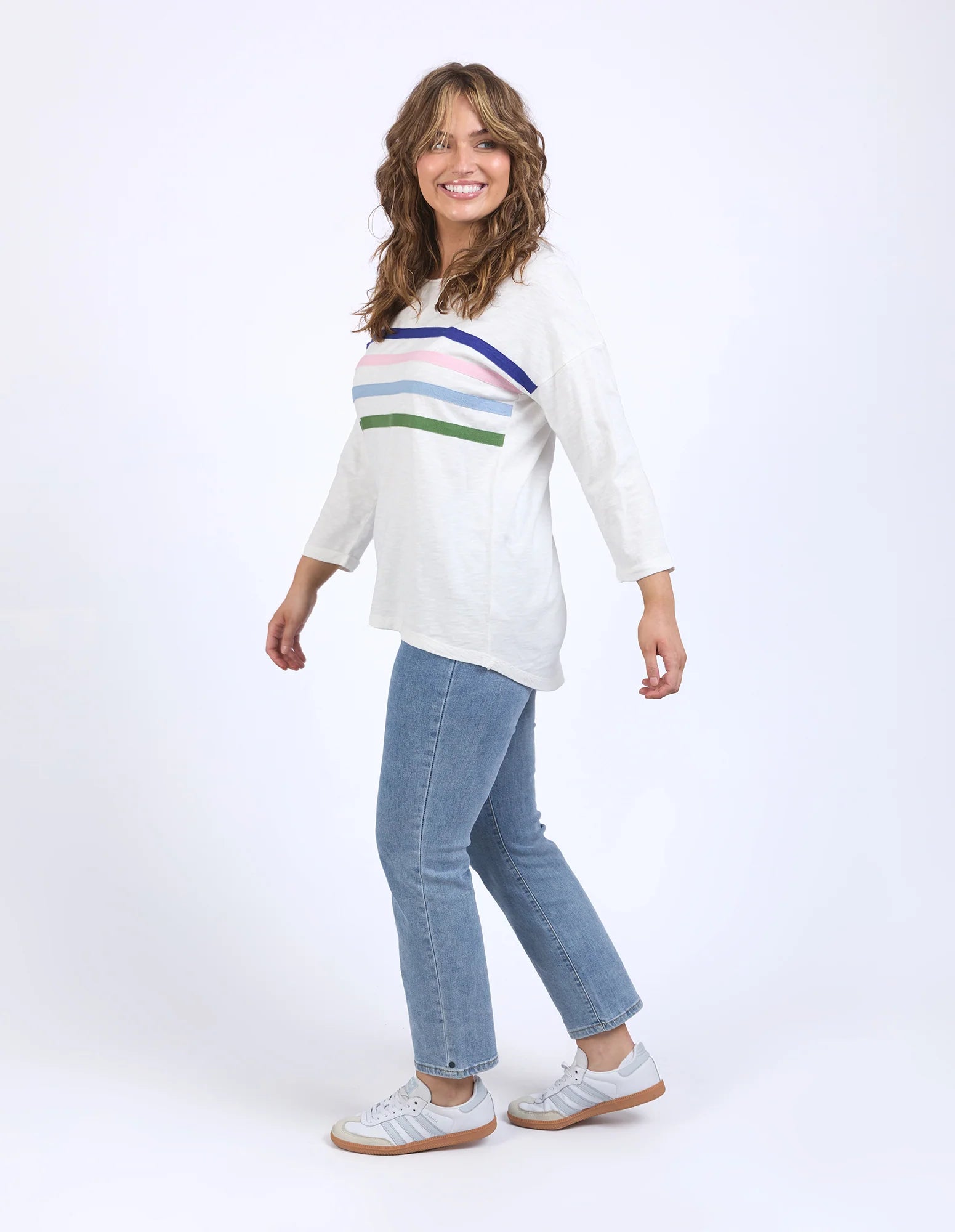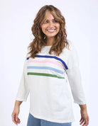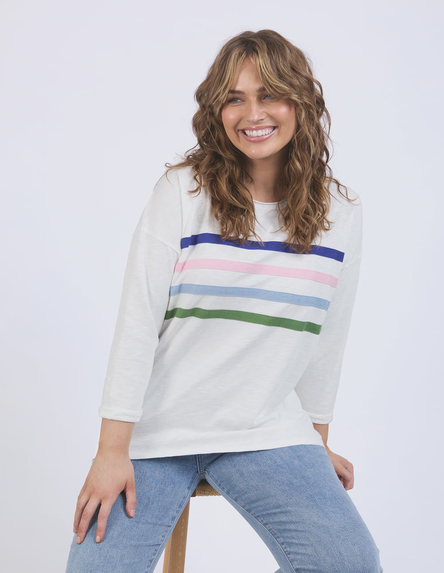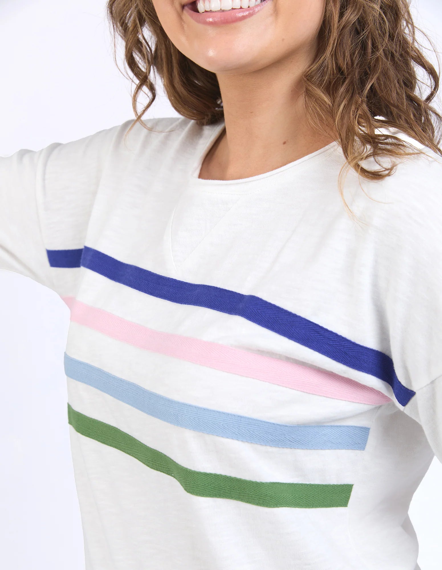 A colourful and fun seasonal crew featuring coloured herringbone tape on the chest. Finished with a curved back hem, this relaxed crew will keep you warm on cooler days.