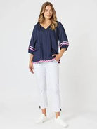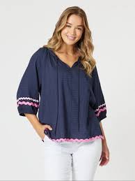 - Crafted in a textured navy cotton, this relaxed-fit top features a soft V-neckline with tie detail, 3/4 elasticated sleeves, and vibrant rickrack trim in pink and white for a fun, feminine finish.