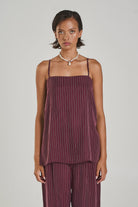 The Kina Pinstripe Tunic Top has been crafted from 100% premium cupro and boasts a straight cut bodice, adjustable straps, and a flowing body with side slits for style and functionality.