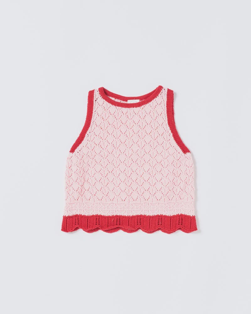Say hello to your new favourite summer layer. The Bella Knit Top in Blush & Cherry brings together vintage charm and vibrant colour with its sweet pointelle knit, bold red scalloped hem, and classic sleeveless shape. Light and breathable for all-day wear, this top is ideal for playdates, parties, or just twirling around the house.