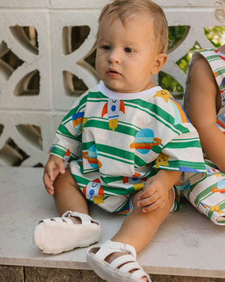 Blast off into style with the Charlie Romper in our cheeky Rocket Man print! This playful one-piece features an adorable rocket design that'll have little ones ready for adventure. Perfect for playdates, casual outings, or lazy days at home, the romper style offers comfort and easy movement. A fun wardrobe essential for the kids that captures that sense of wonder and imagination.