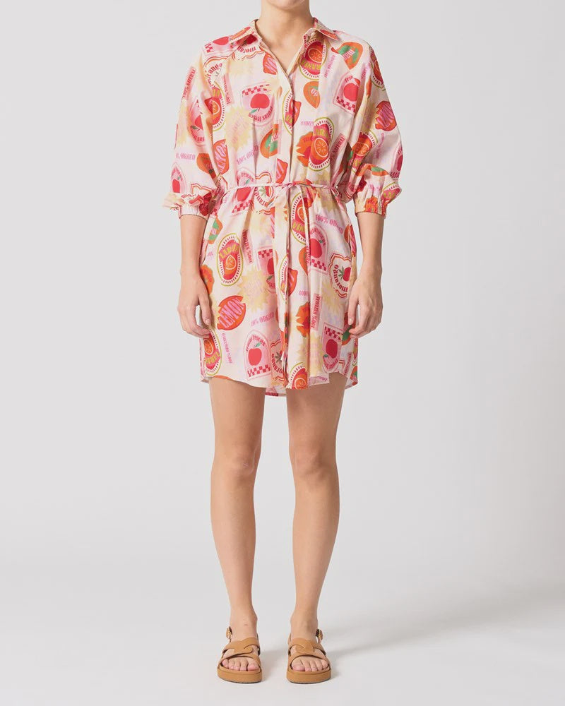 Add a juicy pop to your wardrobe with the Palermo Dress in our vibrant Frutas Frescas print. This new-season mini brings effortless charm with its relaxed shirt dress silhouette, featuring an elasticated waist and adjustable tie to define your shape. Elbow-length sleeves with subtle ruffle cuffs add a soft, feminine touch, while the lightweight fabric keeps you breezy on warm days.