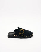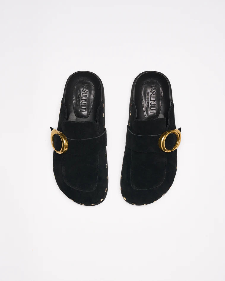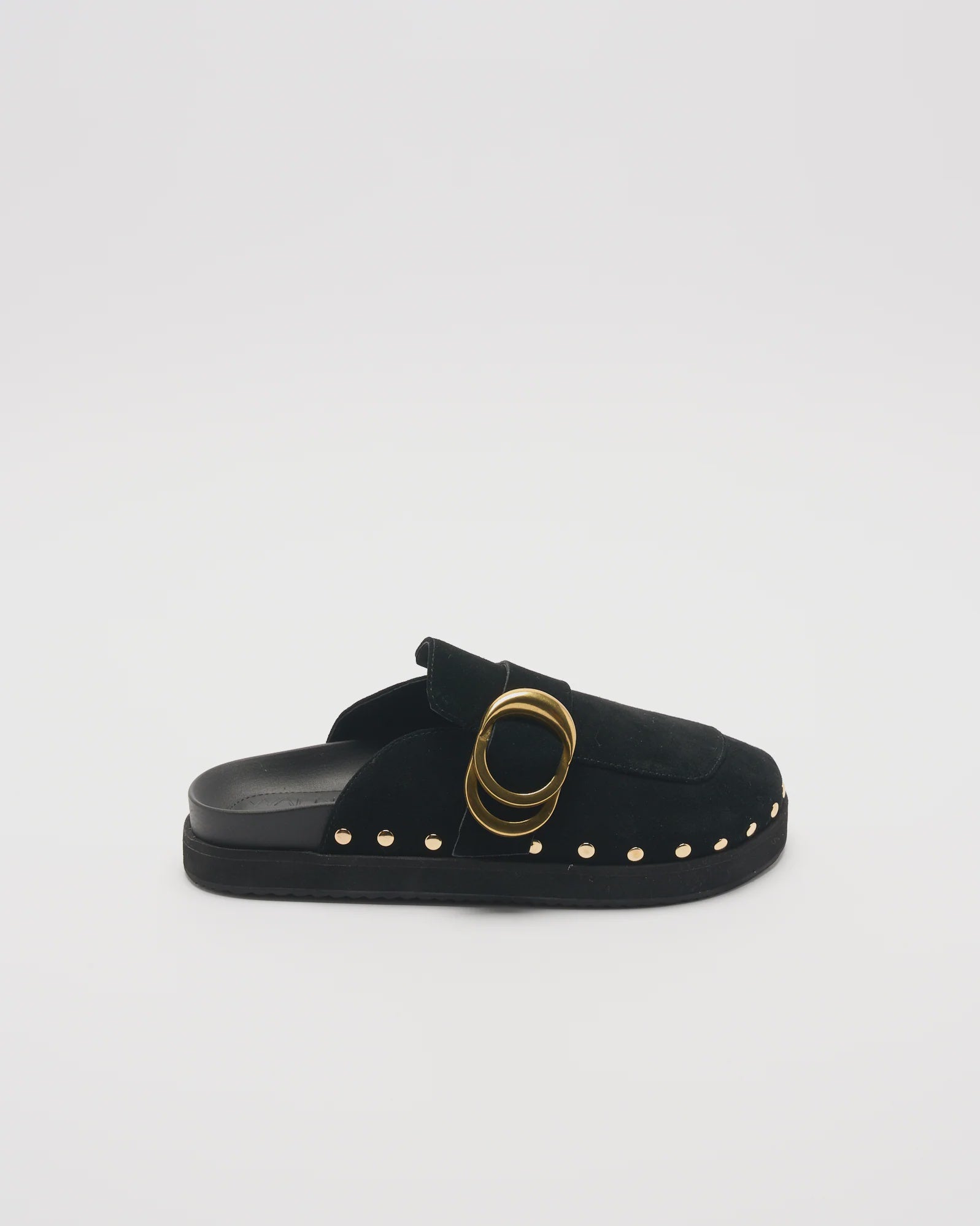 The Pascal Leather Mule is a stylish slip-on shoe featuring a suede finish for a luxurious touch. With a bold oversized gold buckle detail on the upper, it combines elegance and ease. The studded accents around the sole add a modern edge, while the cushioned footbed ensures all-day comfort. Available in both sleek black suede and warm tan suede, this mule is perfect for transitioning between casual and chic looks. Its versatile design can complement a variety of outfits, making it a must-have for any wardrobe.