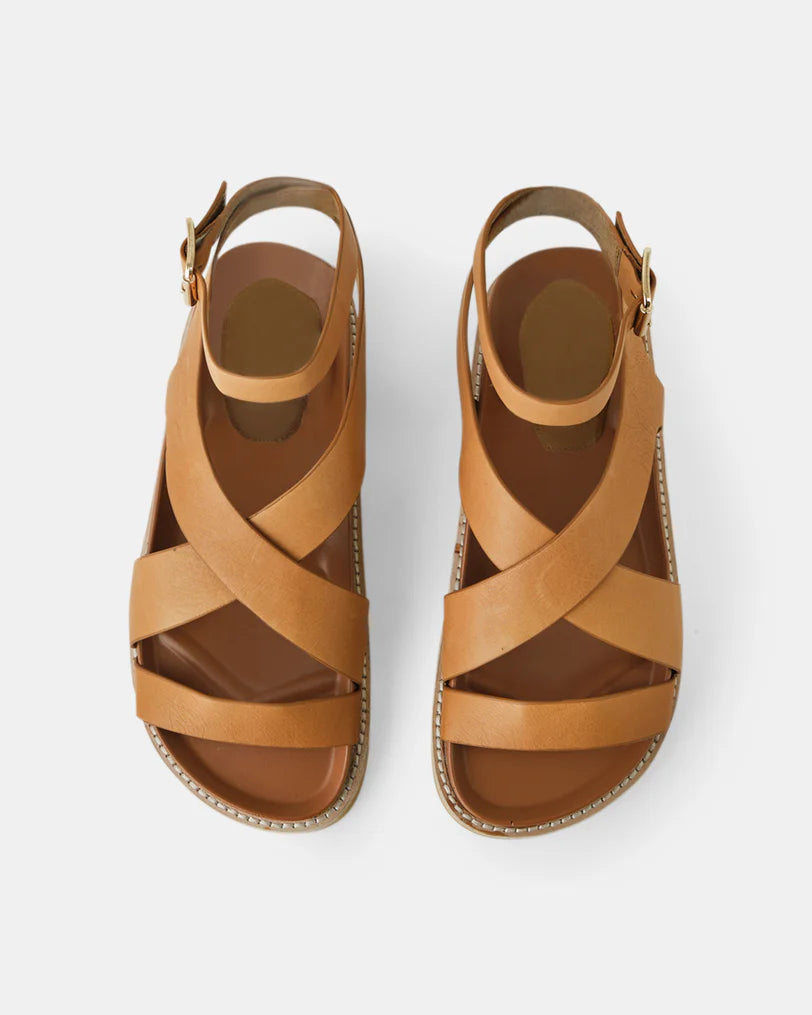 Experience the epitome of both style and comfort with our Pilar Leather Sandal in Sand. Crafted with soft leather crossover straps and a cushioned footbed, these sandals are specifically designed to keep you comfortably on your feet from morning to night.