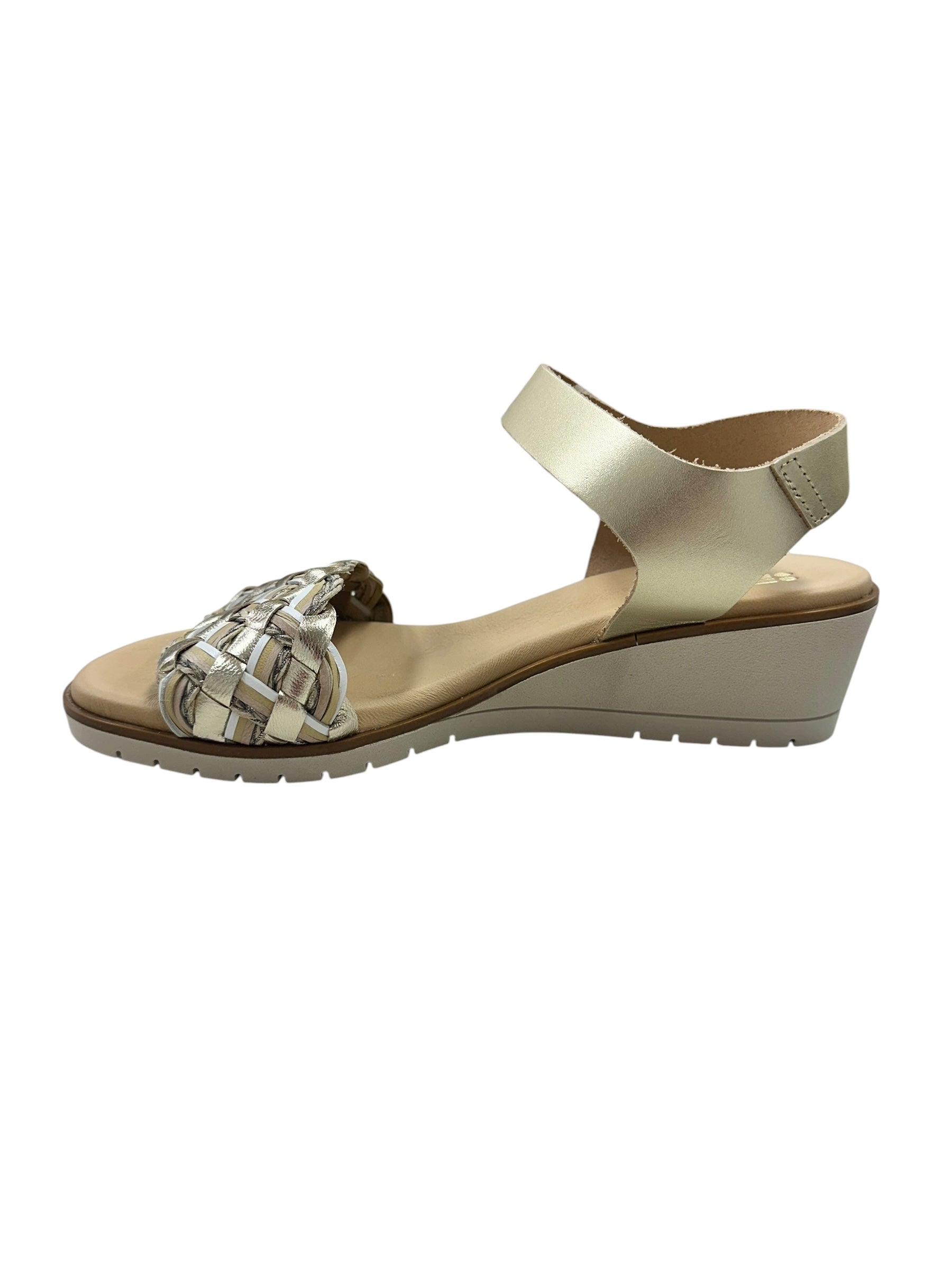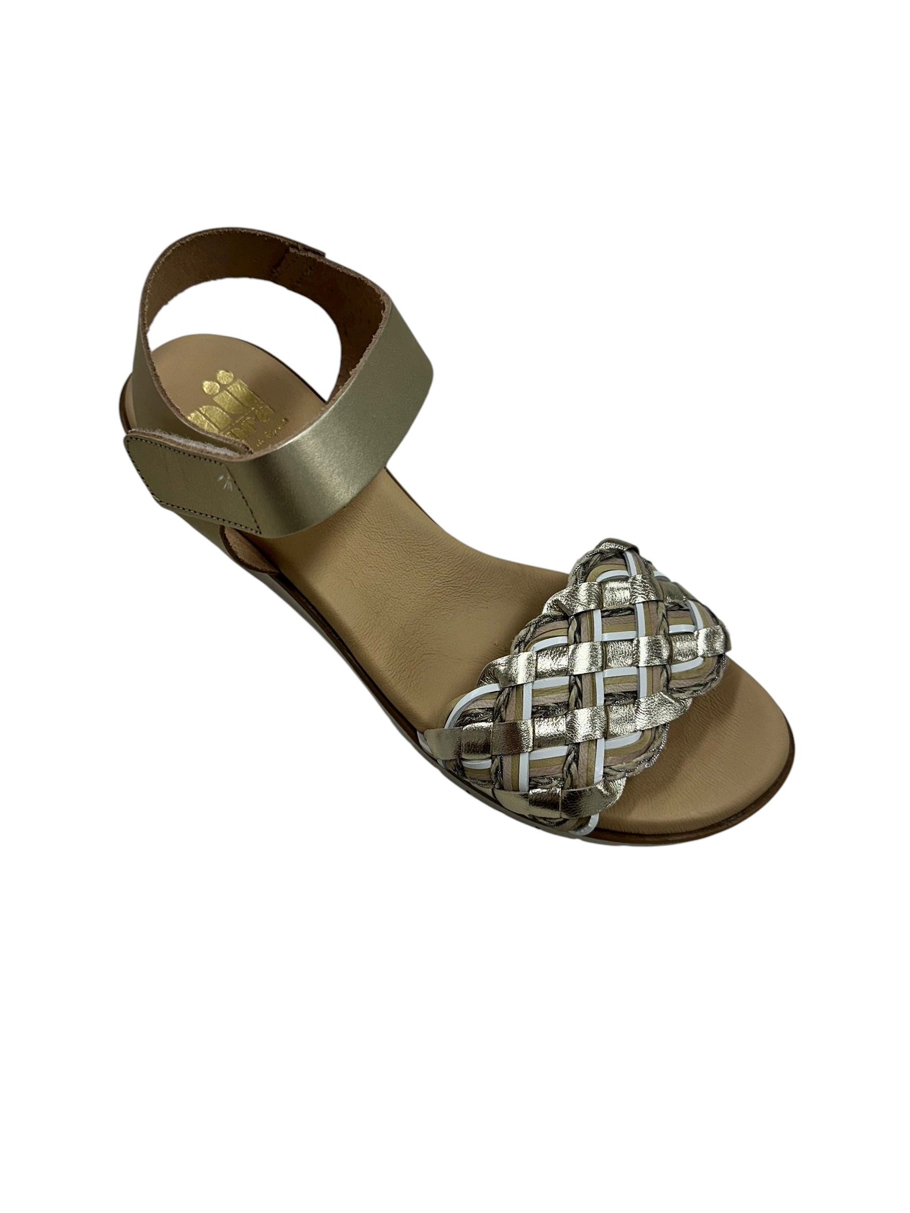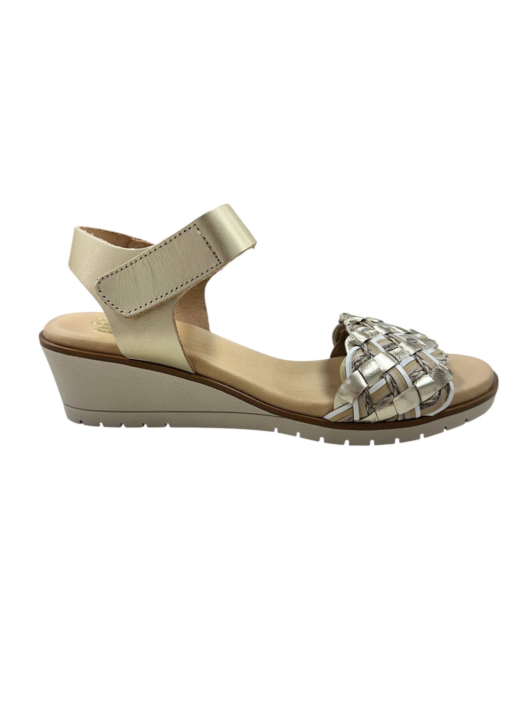 Step into effortless style with Felisa, where comfort meets eye-catching design. This metallic wedge features a secure gold velcro ankle strap that adjusts to your perfect fit, while an intricate weave detail in gold and neutral tones adds texture and visual interest across the toe. Whether you're dressing up or keeping it casual, Felisa delivers all-day wearability without sacrificing that showstopping sparkle.