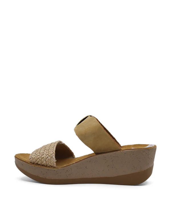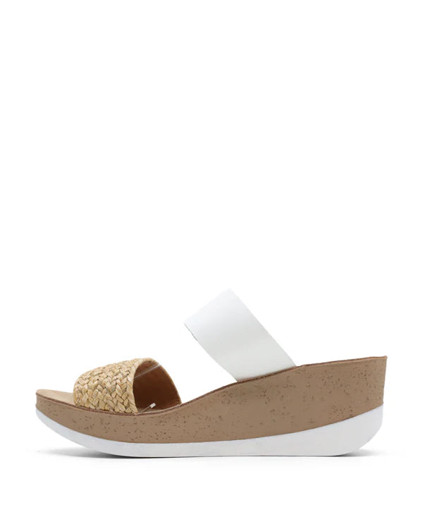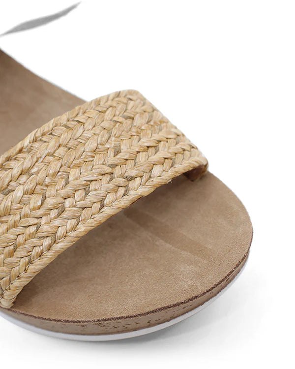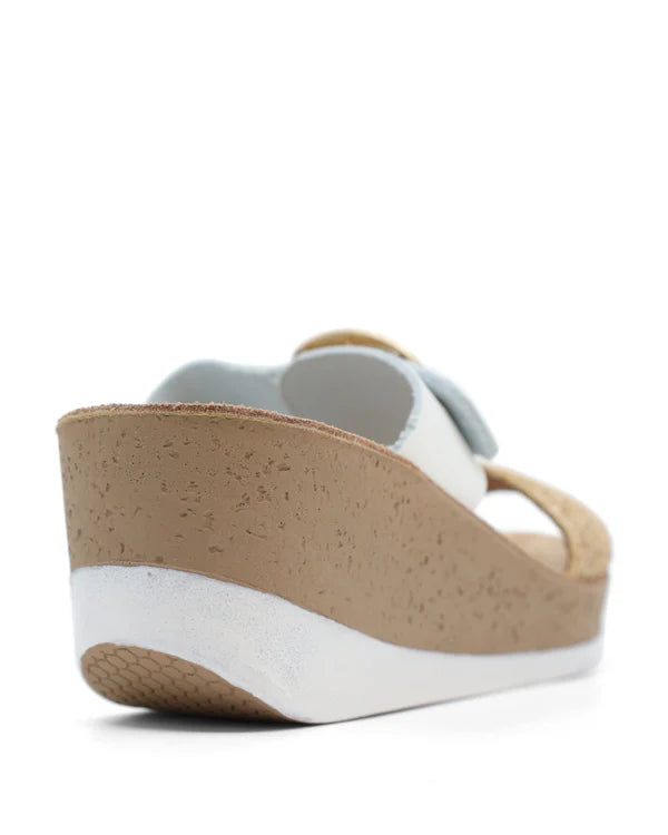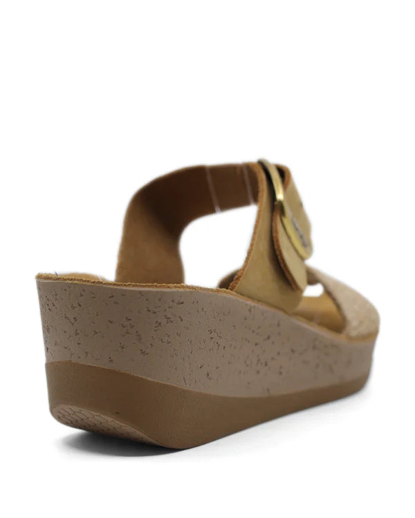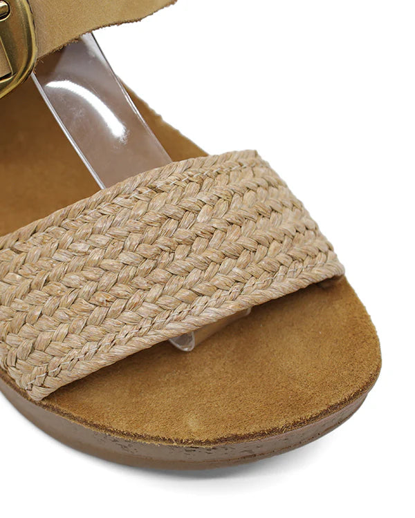 An adjustable wide strap with a buckle closure stretches across this wedge combined with a wicker material .