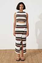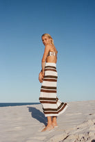The Earth Stripe Cotton Blend Knit Skirt by Zulu & Zephyr is a faux-wrap-style, mid-length skirt featuring a wide elasticated waistband in a soft, textured stripe knit. This feminine sheer knit features an asymmetric front split—perfect for Resort wear styling.