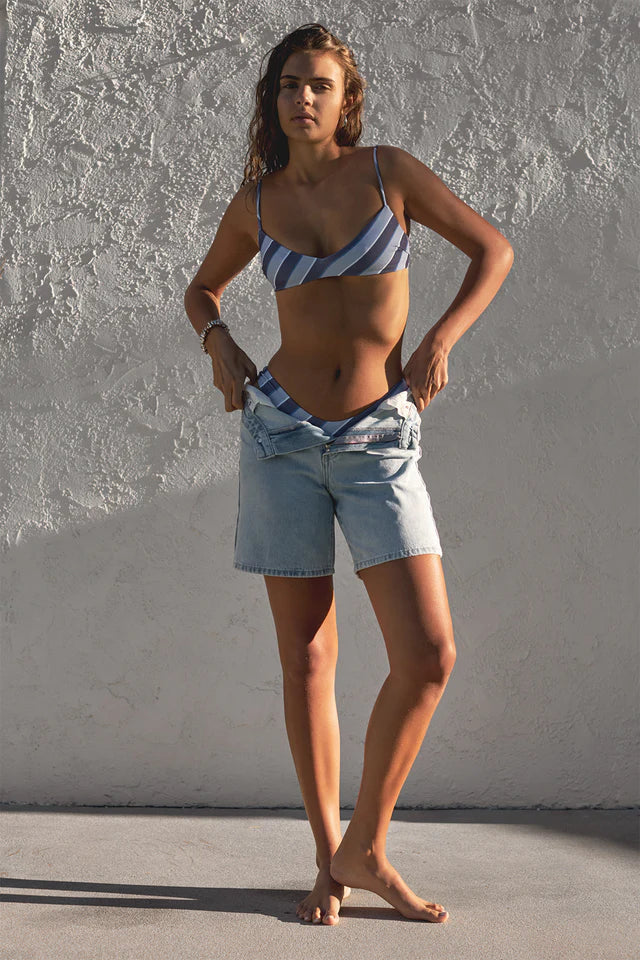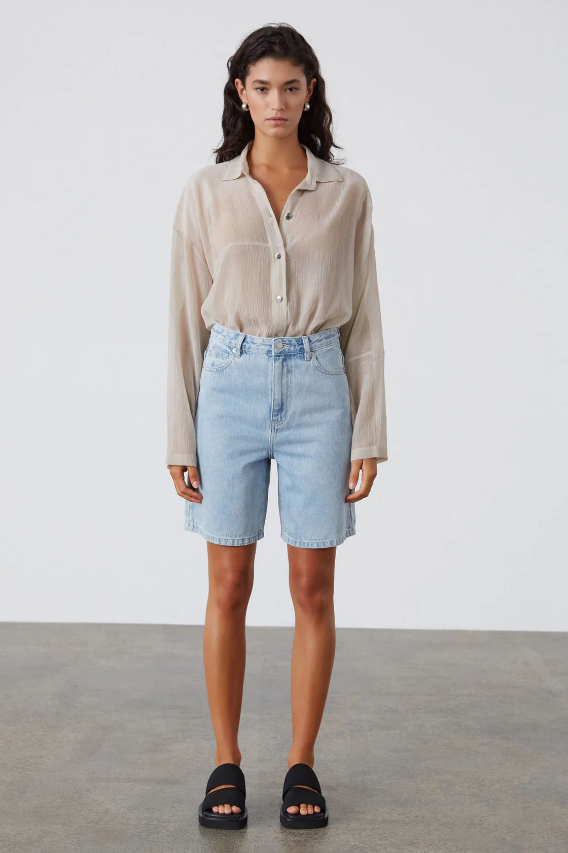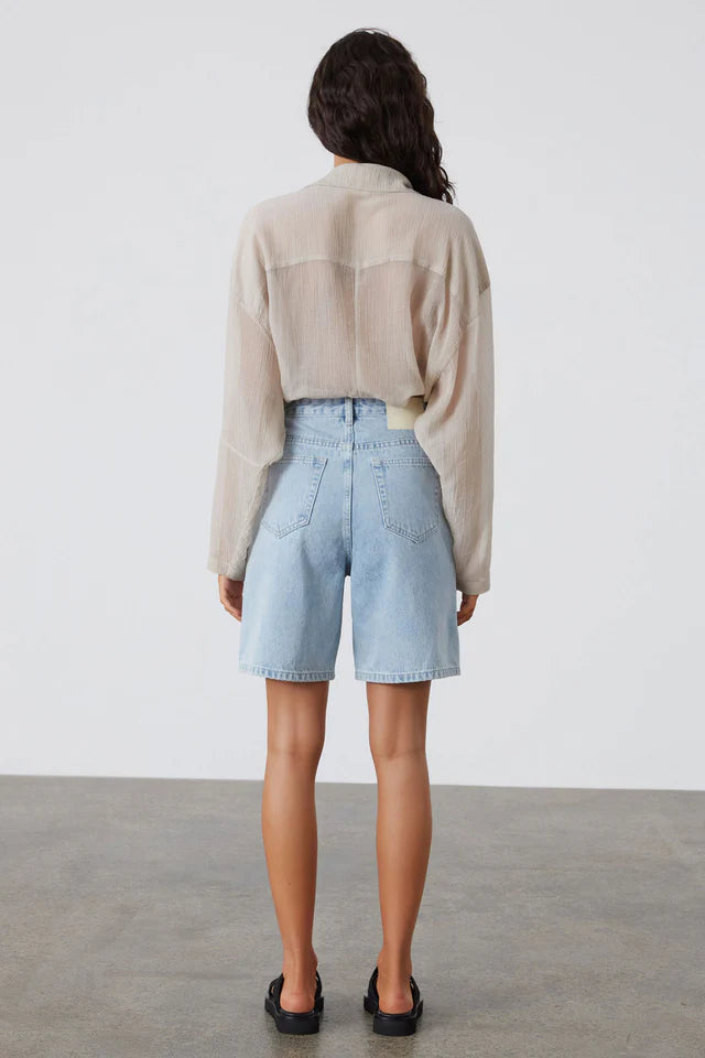 Step into sustainable style with our Recycled Cotton Walk Short in a light wash denim. These versatile shorts are perfect for any occasion and are made from recycled cotton for an eco-friendly touch. Stay cool, comfortable, and fashionable in our recycled denim shorts!
