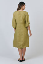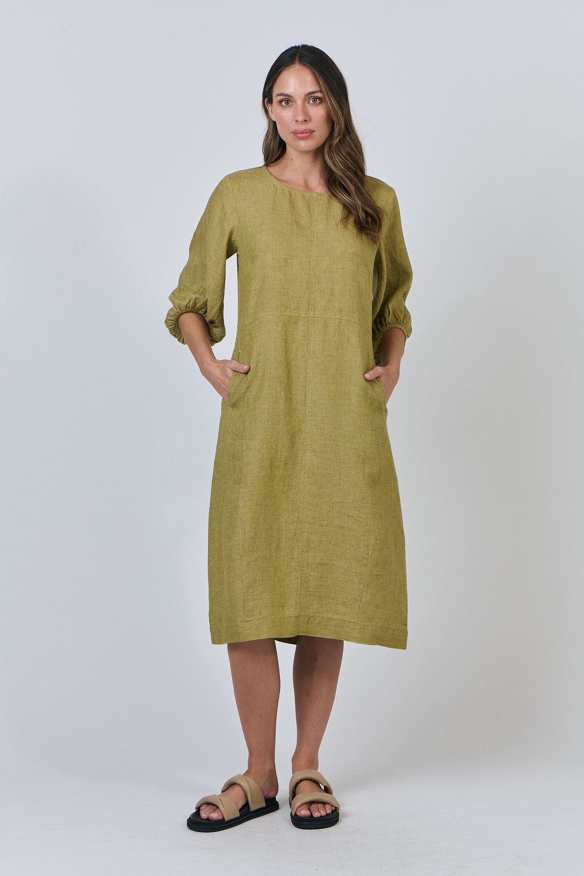 The GA532 is the epitome of elegance with its round neck and elbow length bishop sleeves. The hem line falls gracefully below the knee and the centre seams create a flattering figure. This dress features two side pockets and is made of 100% linen.