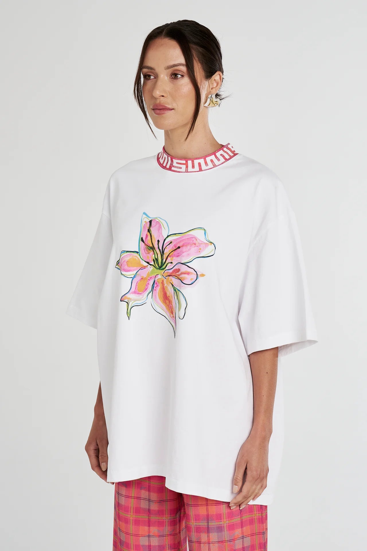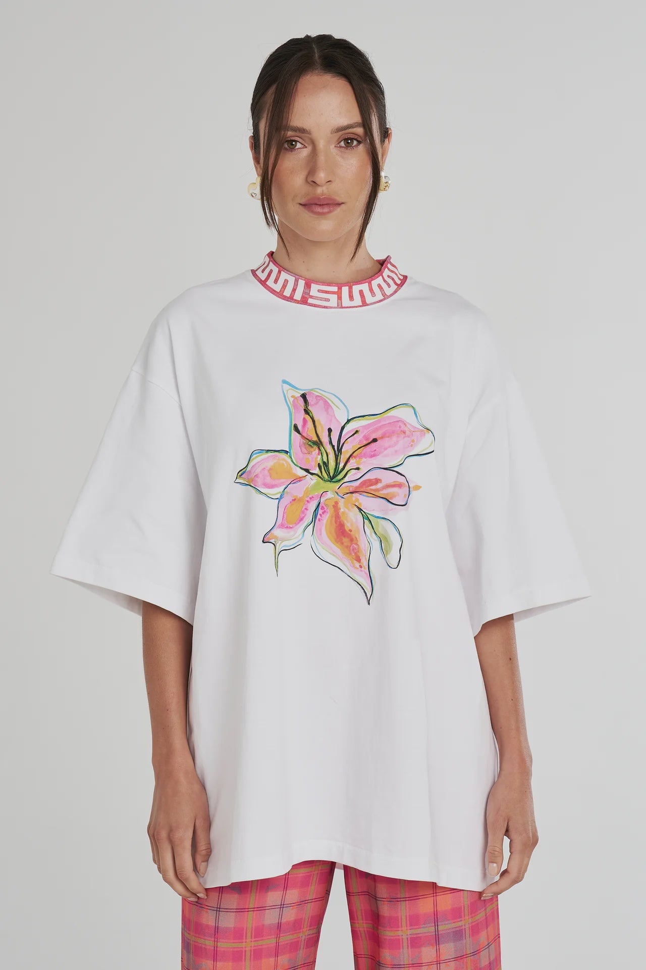 The WASABI NEON band Tee is a classic oversized fit made from 100% Cotton. This short sleeve Tee boast the hand-painted NEON LILY on the front with a custom Summi Summi neon plaid collar.