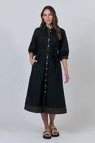 Tie it your way—this GA607 midi dress lets you define the fit and the moment. Featuring elegant three-quarter length balloon sleeves with elasticated cuffs, a full button-through design adorned with contrasting topstitching, and practical side pockets for everyday convenience. The structured collar, belted waist, and decorative striped trim along the collar, cuffs and hemline create a polished silhouette that transitions effortlessly from casual daywear to evening elegance. Made from 100% poplin cotton.