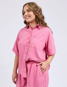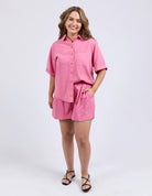 Designed for everyday wear, the bliss washed shirt boasts collar & button front, soft fabric, and match back with bliss shorts. Style it your way for an effortless look that works for any day of the week.