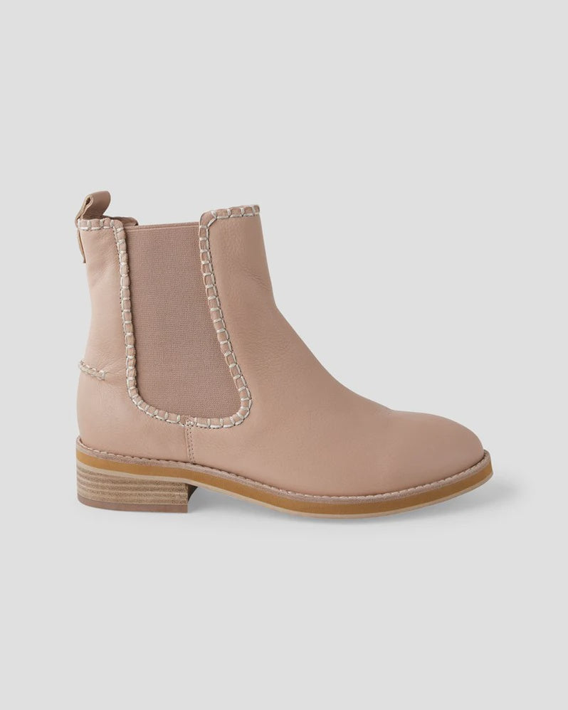 Crafted from soft buttery leather, these ankle boots are a winter essential. The Cinda boot in Camel, featuring blanket stitching details in beige, adding a touch of style to this classic design.