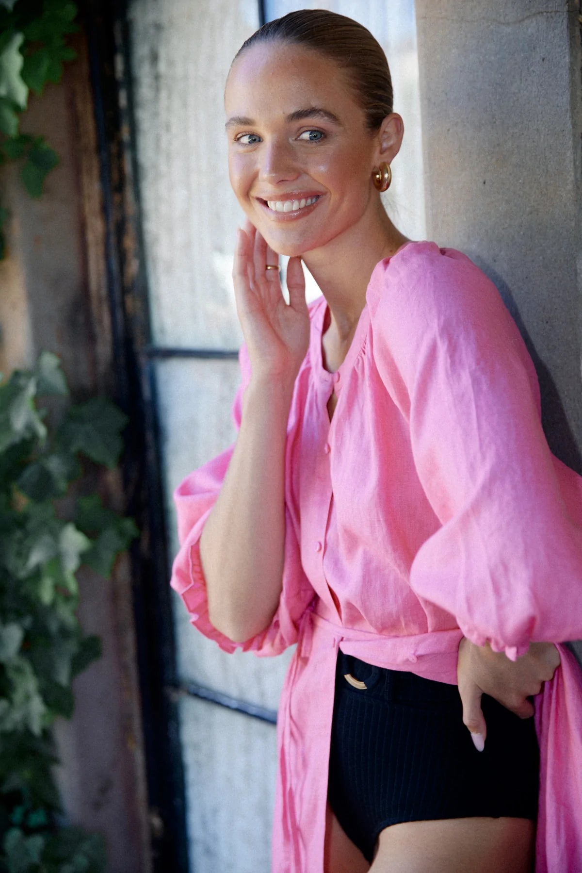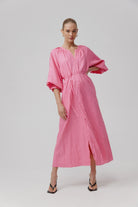 Coco features a button up front leading to a round neckline, with optional self-tie belt for added styling options. This midi is finished with in-seam pockets and an elastic frill cuff.