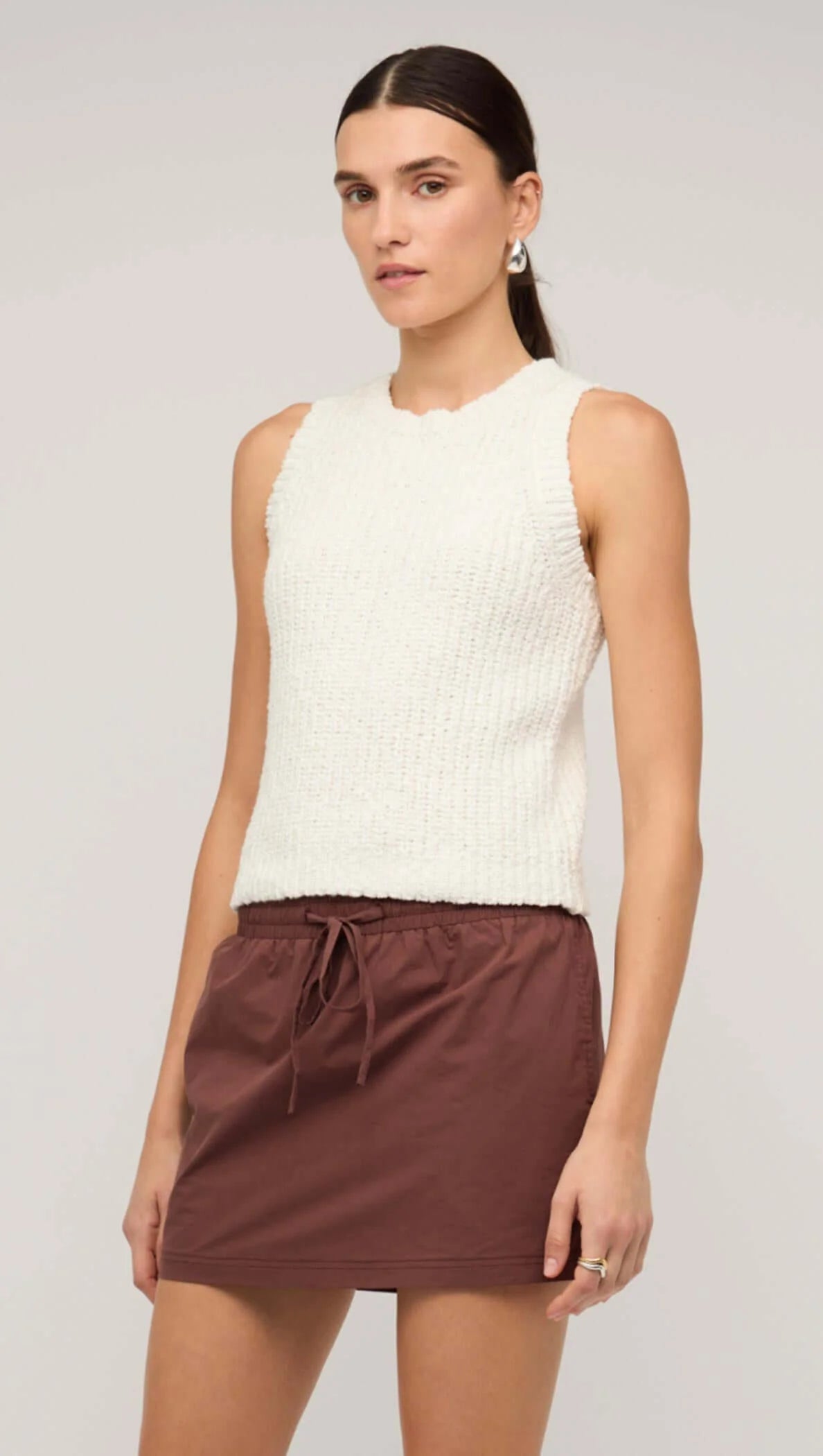This playful chocolate brown mini skirt adds a fun twist to your wardrobe with its comfy drawstring waist and handy pockets. Perfect for easy, everyday style that keeps you looking cute and feeling free to move.