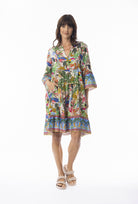 Be transported by the horizon-chasing Dani Layered Frill Sleeve Dress. Featuring an Amazonian flora and fauna print, button up mandarin collar, a frill tiered skirt that falls at the knee, three-quarter frill sleeves, and unique hand drawn prints, this dress is so easy to wear. The perfect dress for soaking up the sun on a warm summer day!