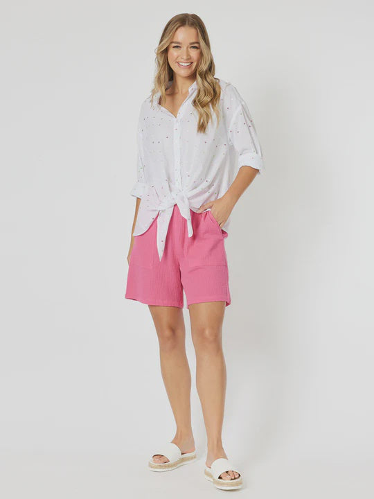 - As the multi coloured spots can literally pair back with any bottoms - coloured denim, linen or cotton