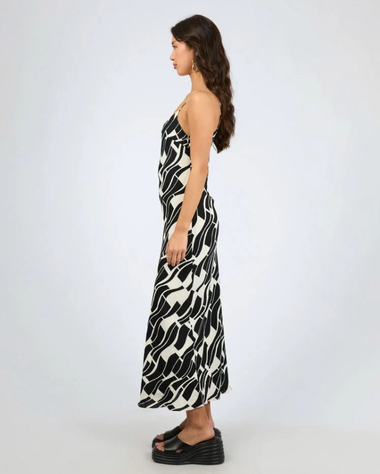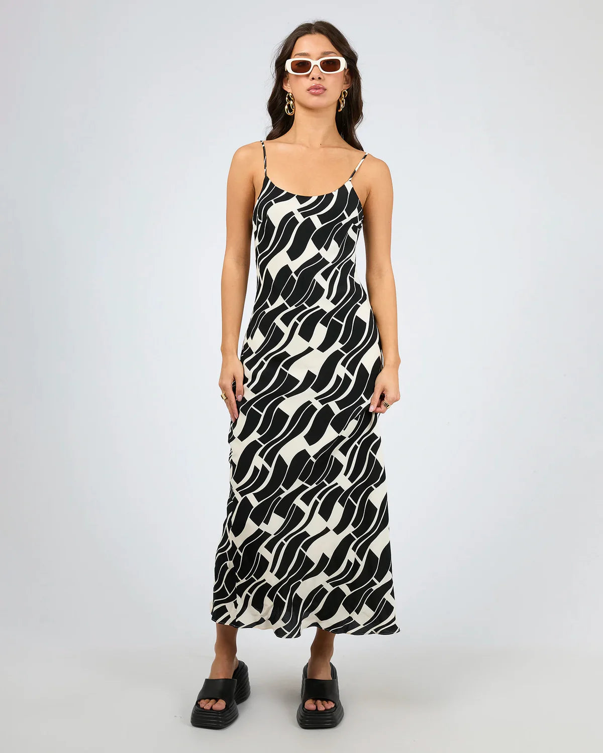 The Estelle Maxi Dress by Jorge is a stunning and sophisticated piece that exudes effortless style. Featuring a bold black-and-white geometric print, this maxi dress is crafted from lightweight, breathable 100% viscose, ensuring both comfort and elegance. The adjustable spaghetti straps and slightly lower back create a sleek, feminine silhouette, while the side invisible zip offers a seamless fit. Fully lined for added comfort, the flowing design complements its bold print perfectly. Dress it up for an event with a chic kitten heel or keep it casual with chunky slides and statement sunglasses for a versatile, head-turning look.