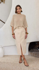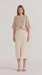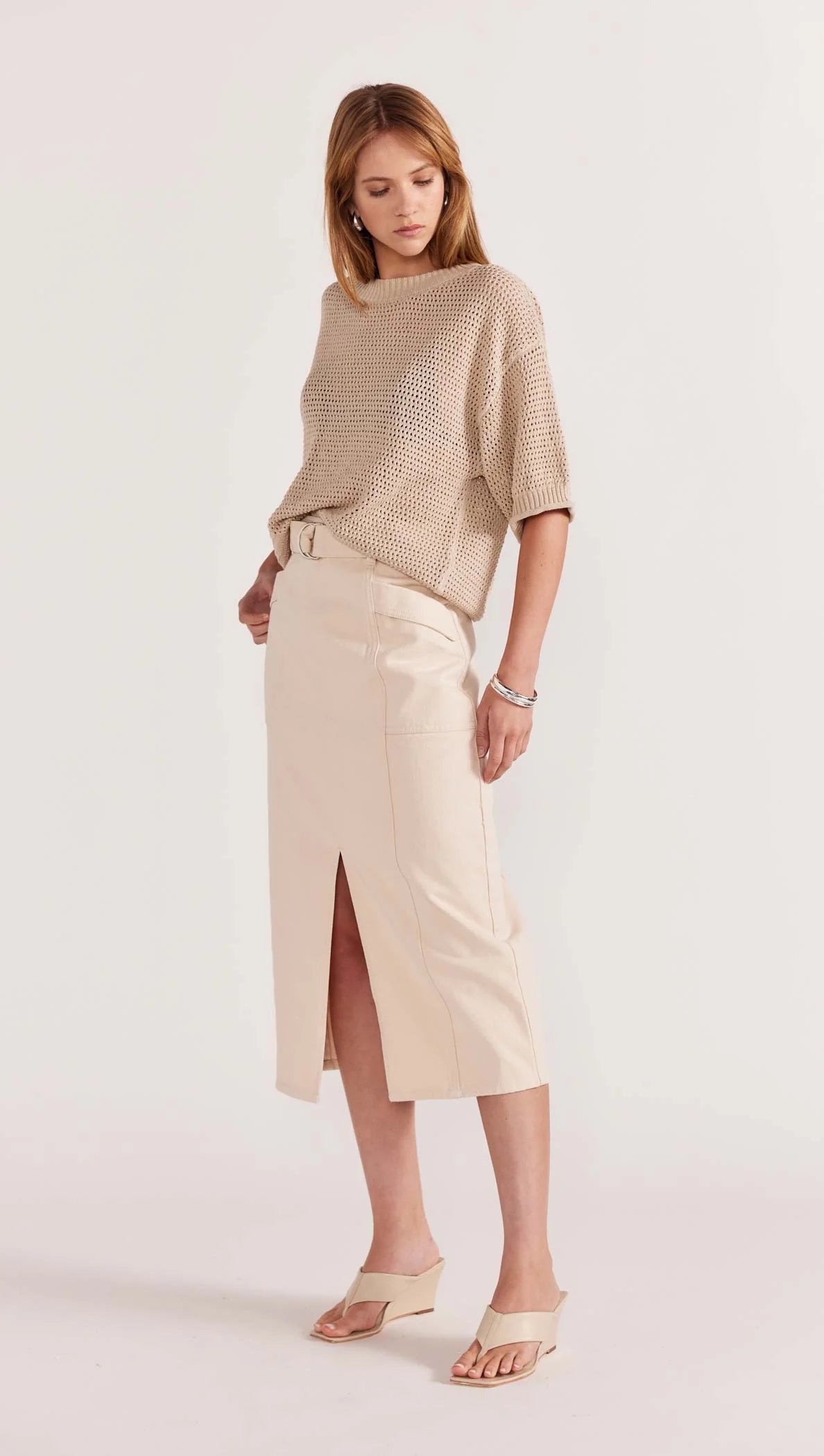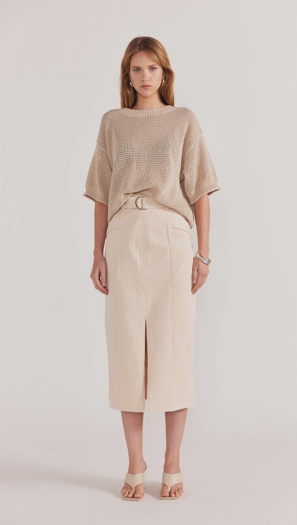 The Ines Denim Midi Skirt is the skirt that will never get old. Adding fresh neutral tones to your essential wardrobes is the instant win you can't go wrong with for seasons to come. Style with our natural toned Nora Open Knit Tee and nude heels or sandals for a all round neutral look.