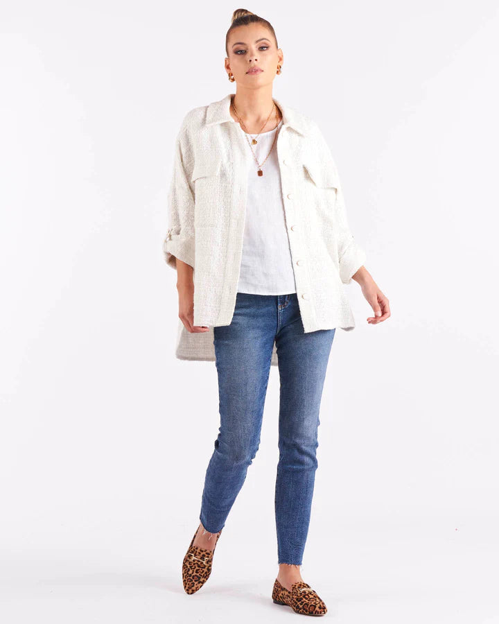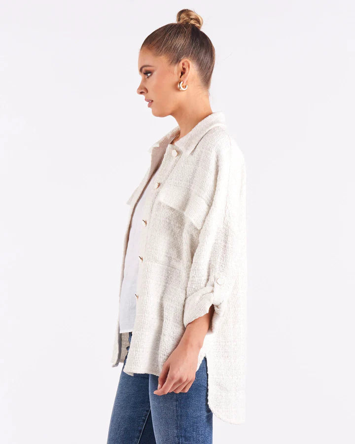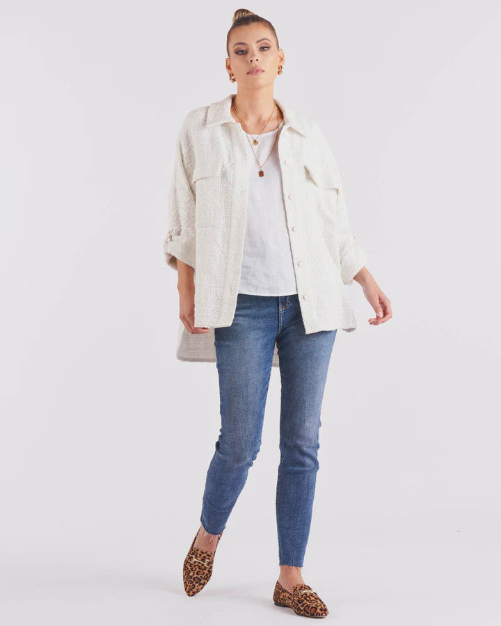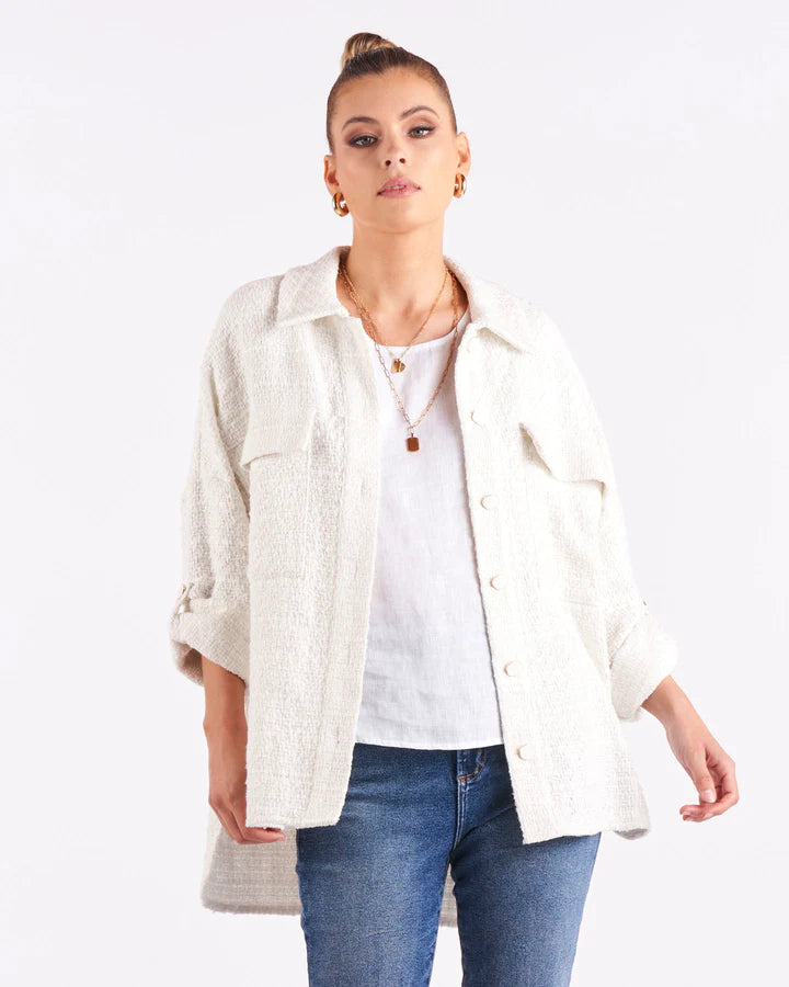 Say hello to this season's styling in the Lovelines jacket. Crafted from a soft boucle in a button down shirt construction, with tab sleeves. This piece is chic and oh so comfortable! With styling options a plenty it will become a fast staple in your wardrobe.