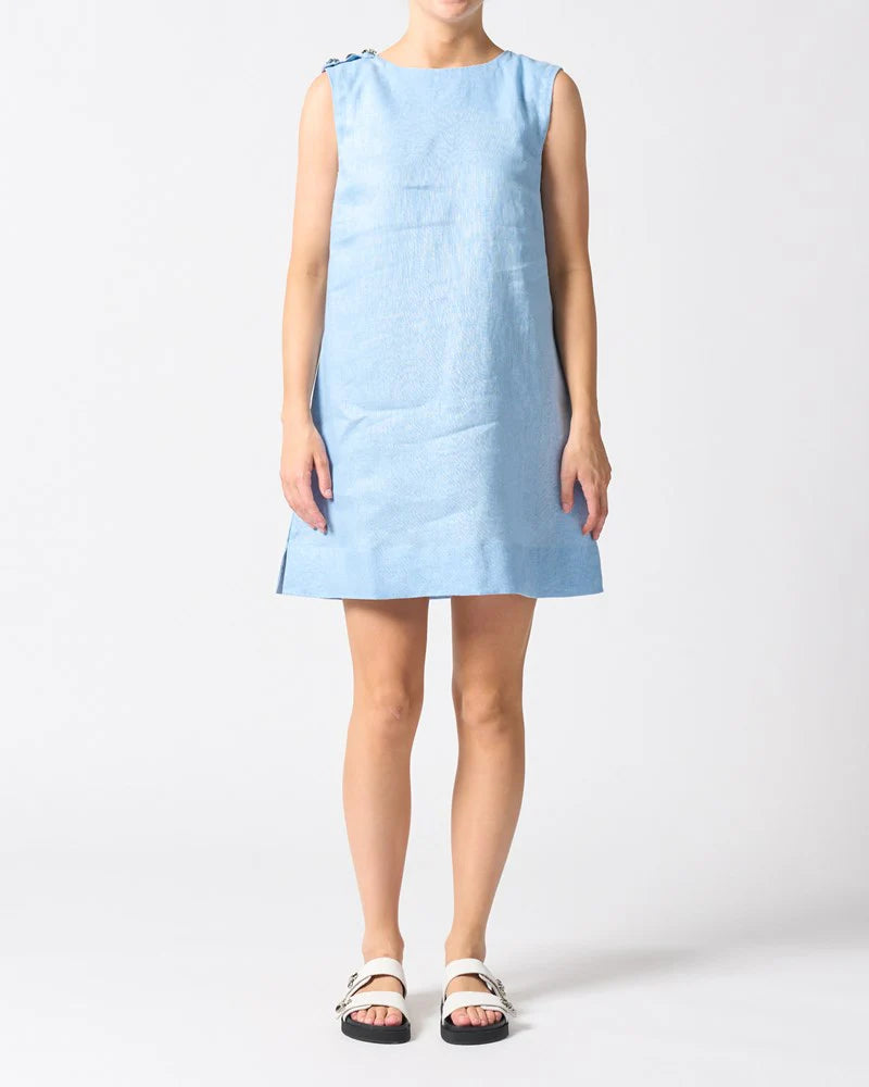 The Malta Mini is your go-to for effortless summer styling. Cut in a fresh sky blue linen blend, this sleeveless shift features a clean, A-line silhouette with modern side splits and a bow detail at the shoulder for a subtle touch of charm. Lightweight, breathable, and endlessly versatile—just throw on and go.