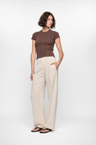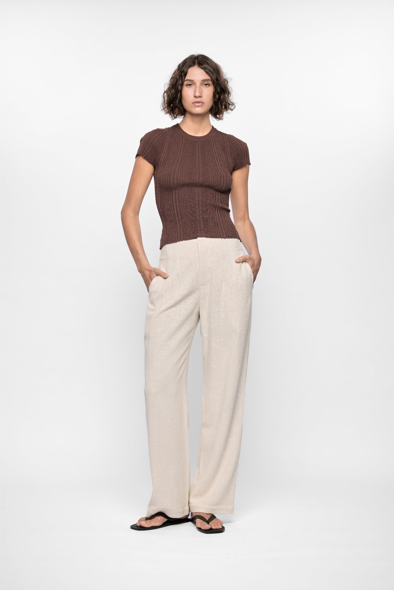 The Maya Ribbed Knit Tee is your new go-to for effortless style and comfort. Crafted from stretchy, ribbed fabric, this brown tee hugs your curves with a flattering, fitted silhouette. Perfect for layering or wearing solo, it adds a playful touch to any outfit while keeping you cozy all day long.