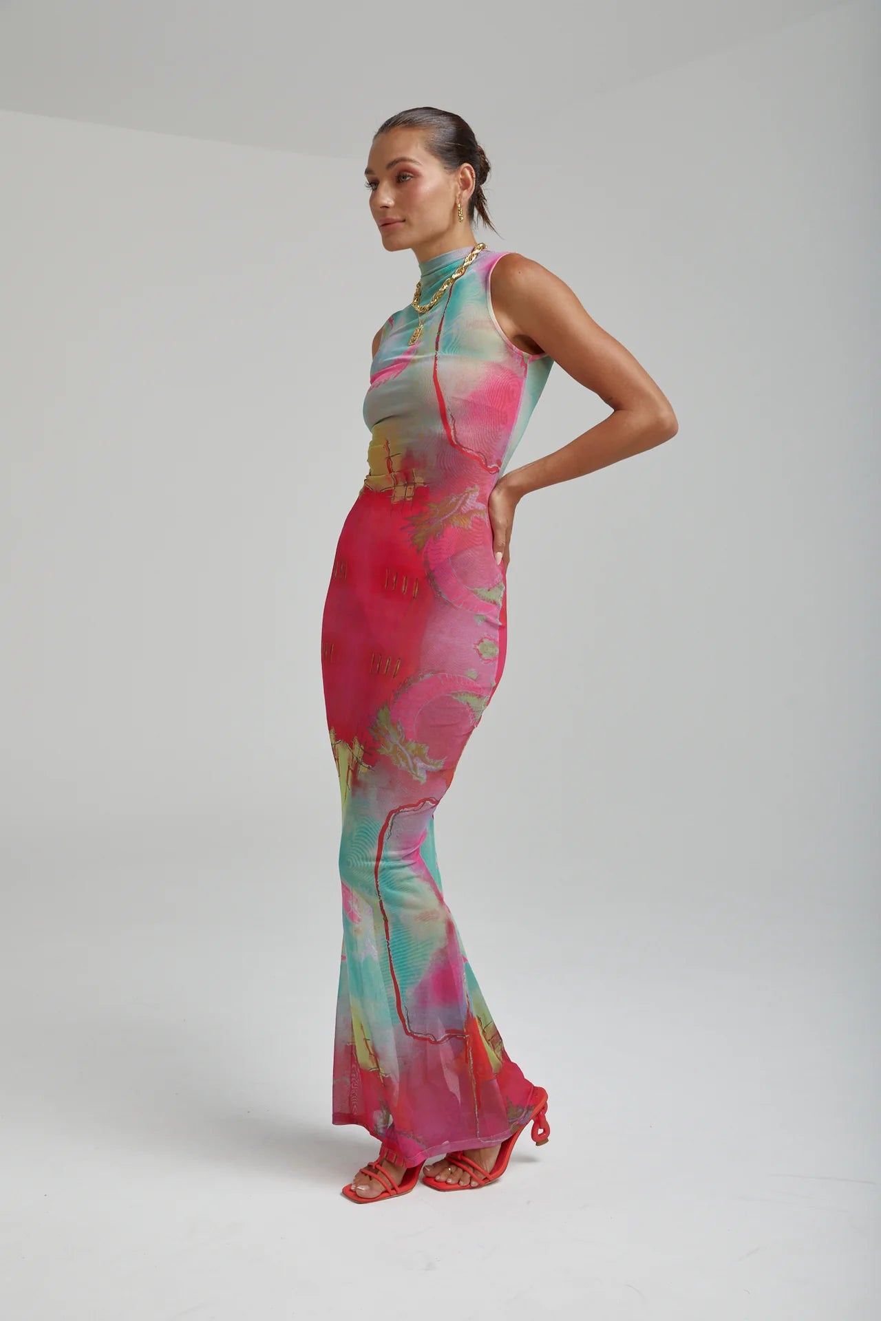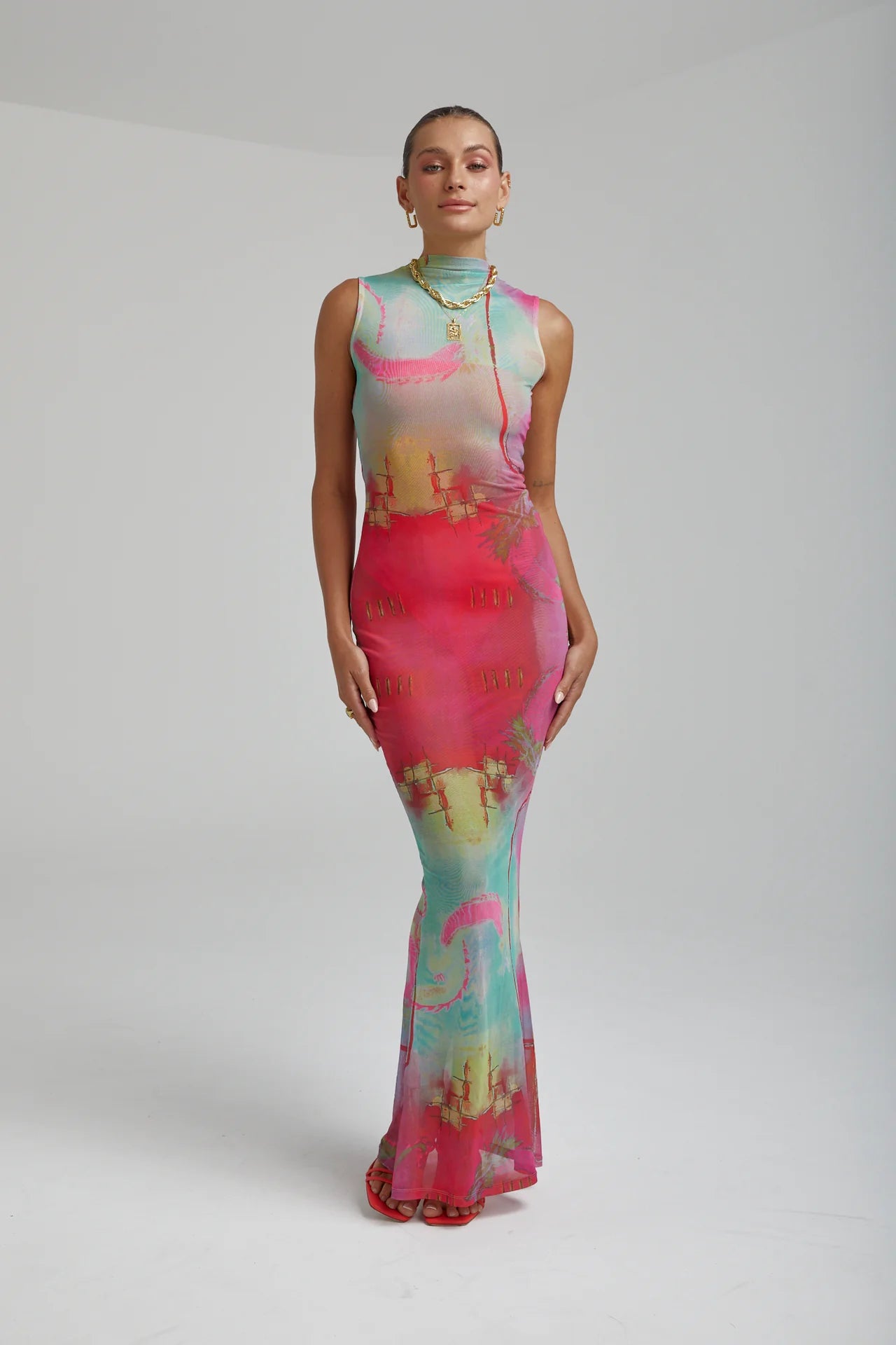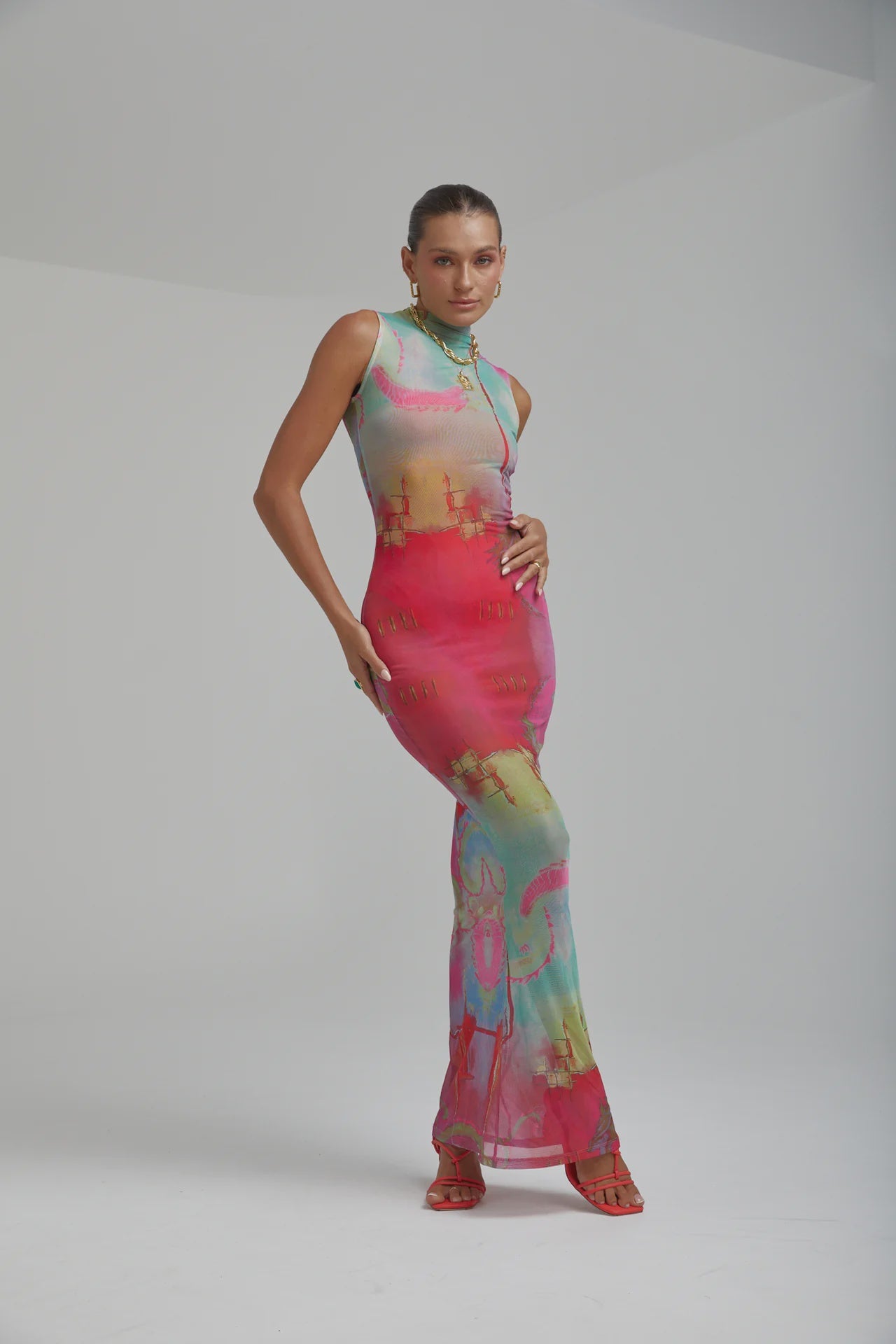 Unleash your sultry side with our infamous Mesh Maxi Dress in our hand-painted Dragon Blaze print. Make a statement and slay the look with this vibrant sheer dress.