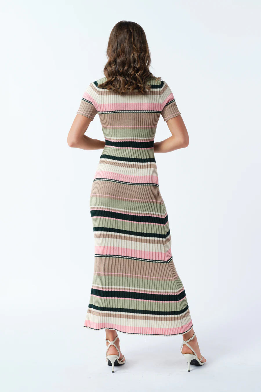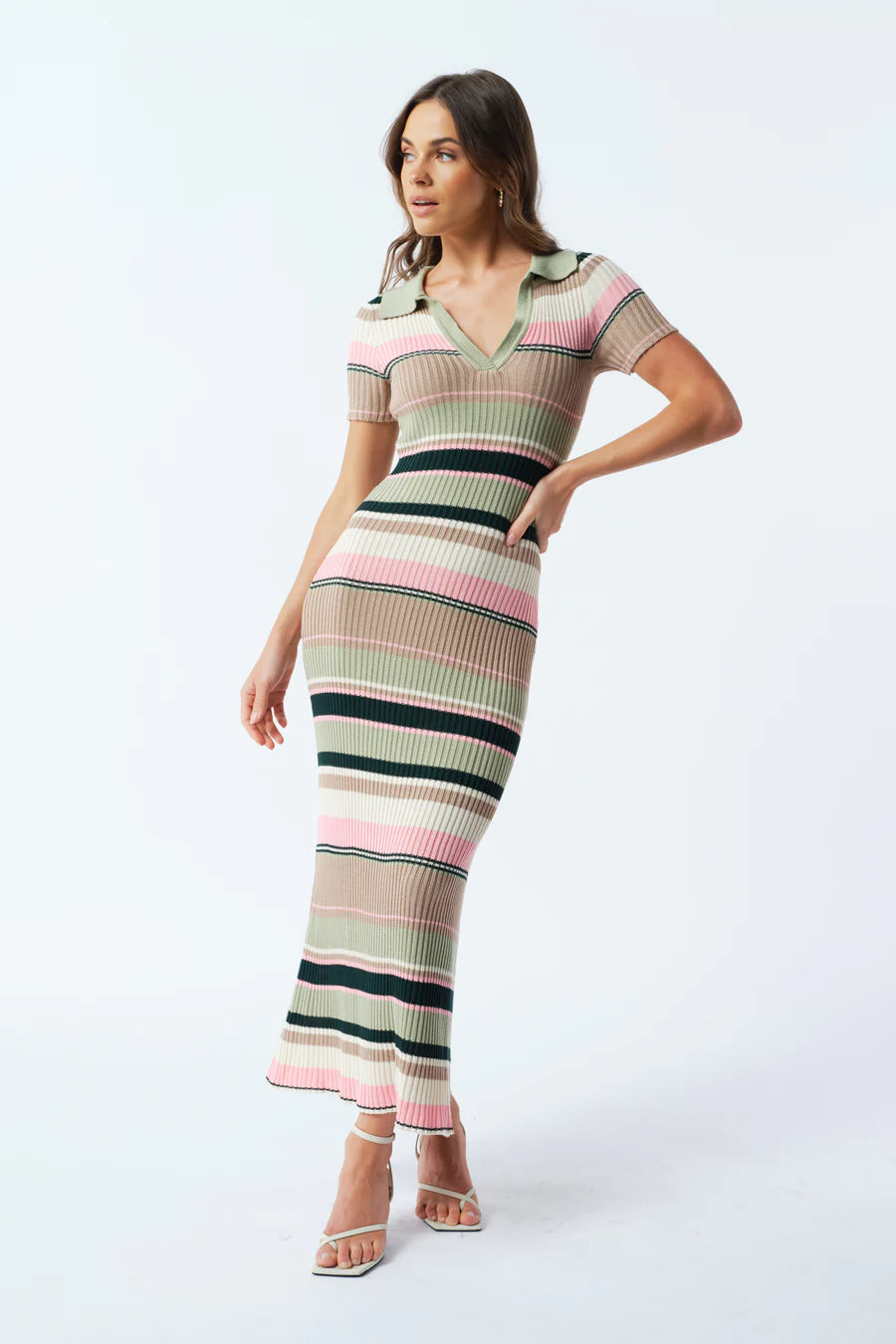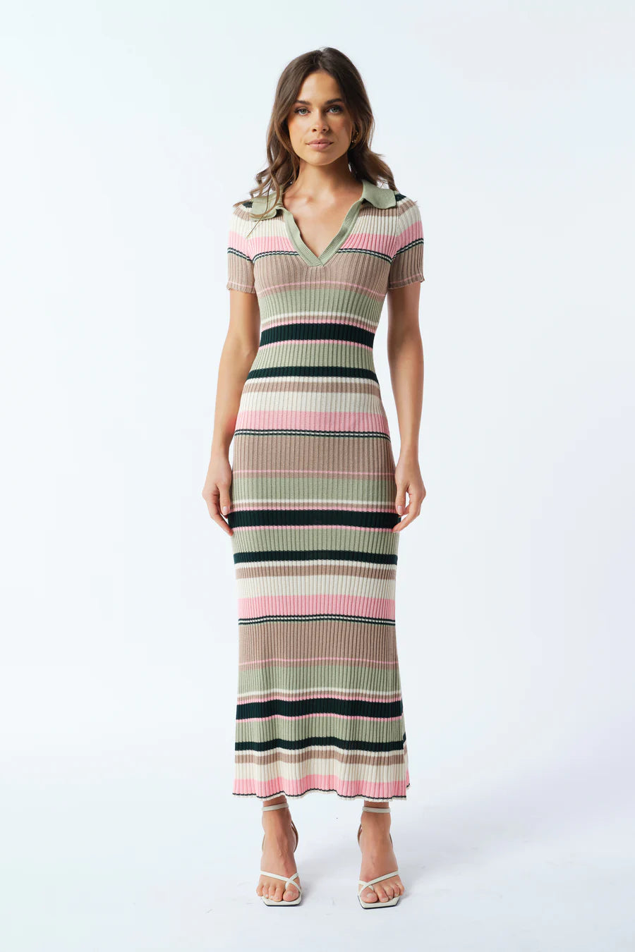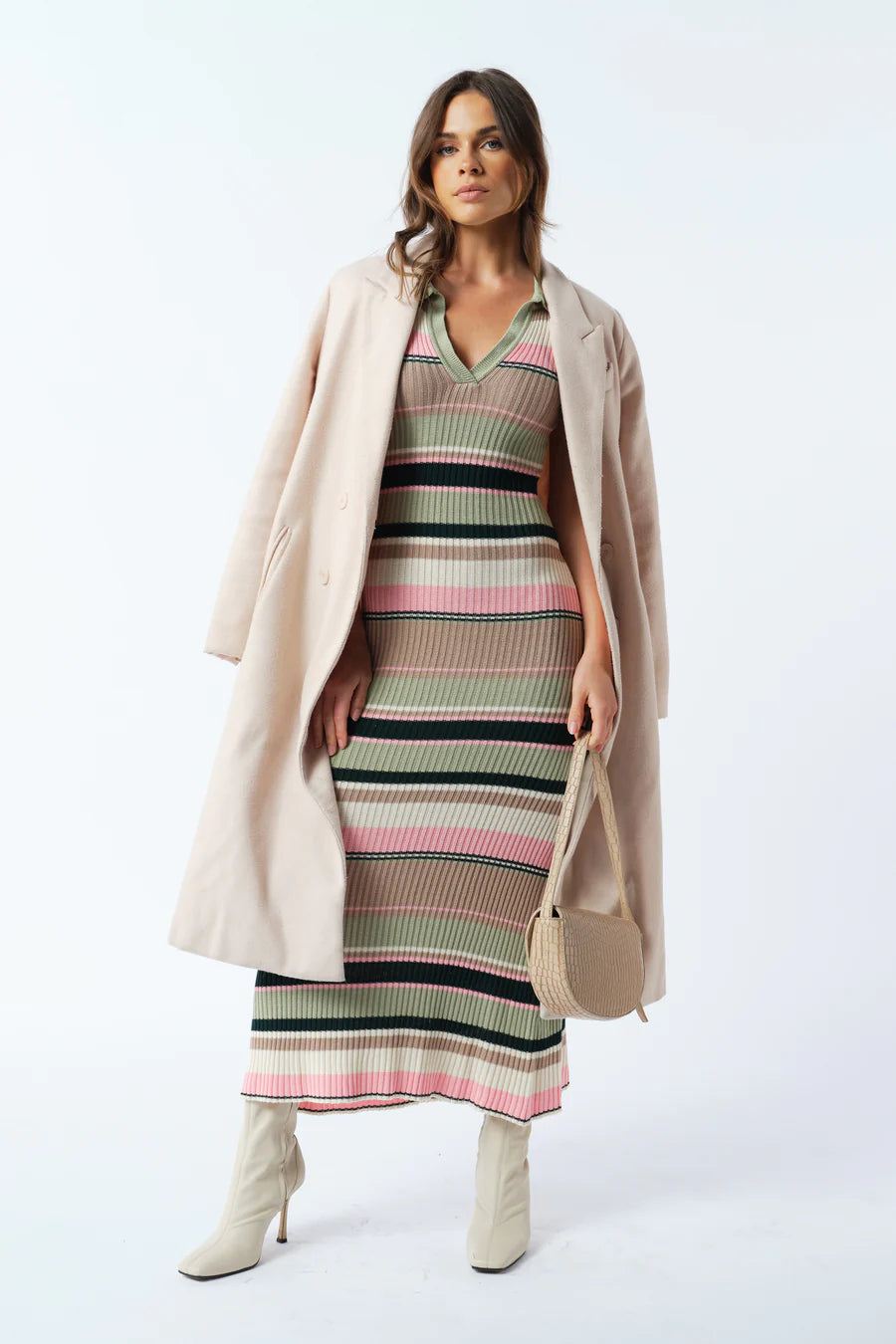 The dress of the season, welcome the Remi Stripe Ribbed Knit Midi to your wardrobe this winter. Designed in a green, pink, white, and beige striped colourway in a stretchy, ribbed knit fabric. Finer details include sage green collared neckline and short sleeves. We love to style this midi with cream boots and a cream coat.
