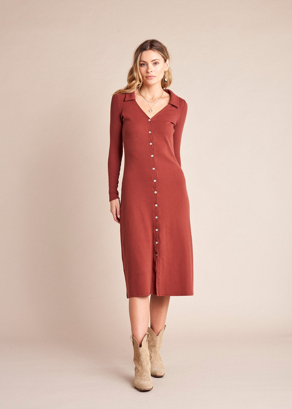 CRAFTED FROM A RIBBED KNIT FABRICATION, THIS MIDI DRESS FEATURES LONG SLEEVES, A V-NECKLINE AND A BUTTON DOWN DETAIL AT THE FRONT. DESIGNED TO SKIM AND FLATTER THE FEMME FORM IN ALL THE RIGHT WAYS.