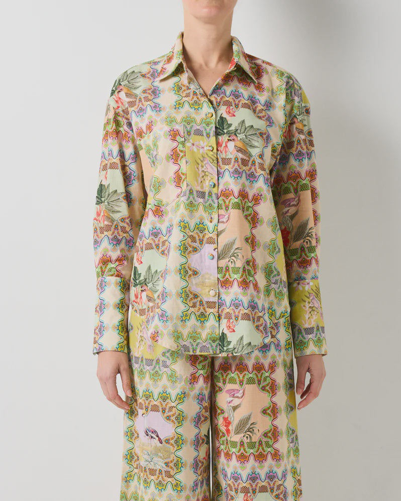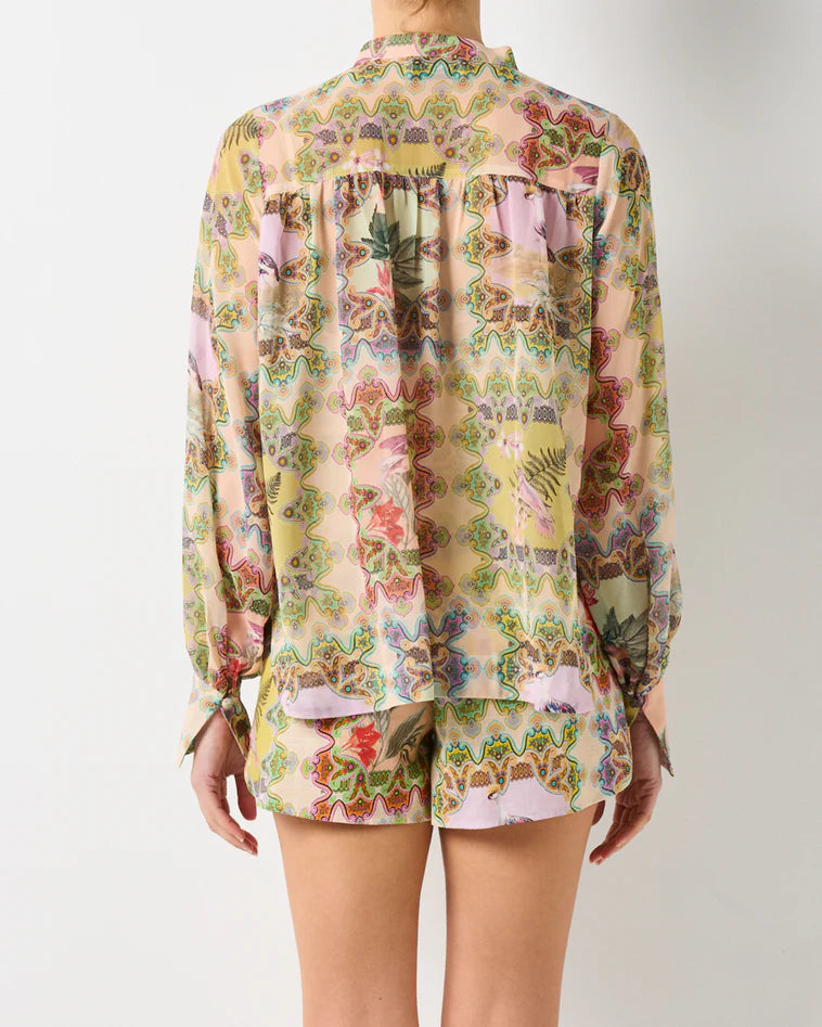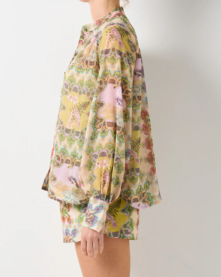 The Athens Shirt is a graceful and flowing shirt that blends modern sophistication with timeless elegance. Featuring a loose silhouette with long blouson sleeves and a button-up neckline.